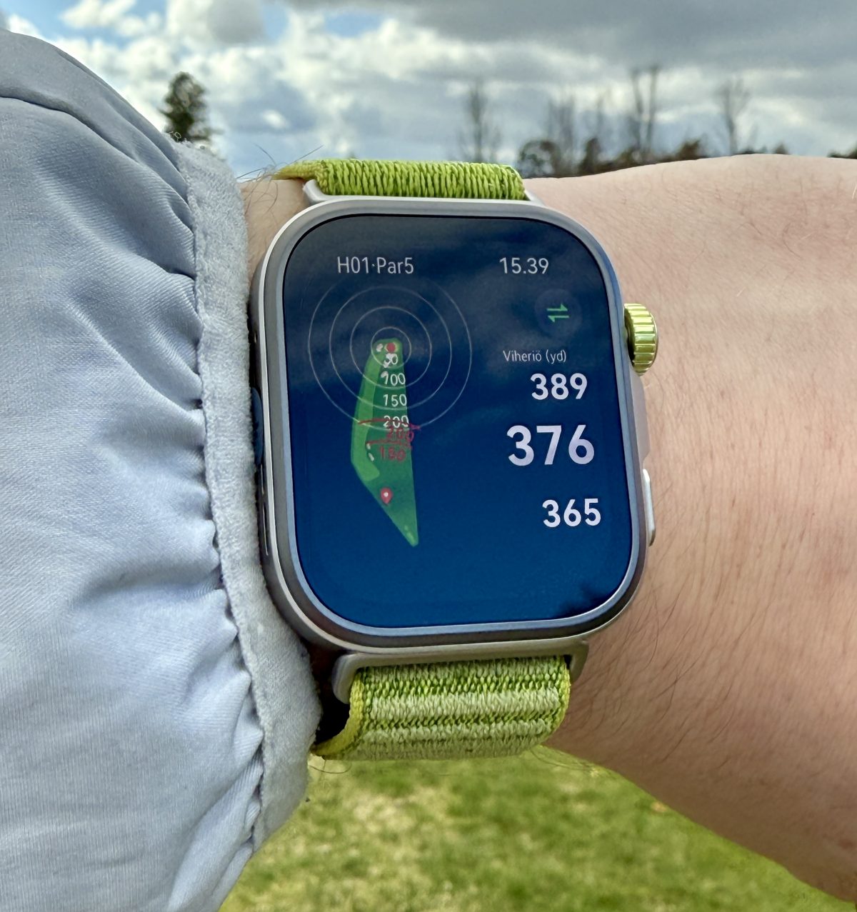 Huawei Watch Fit 4 Pron golfkenttätila kertoo paikannuksen perusteella tietoa väylästä ja etäisyyksistä.
