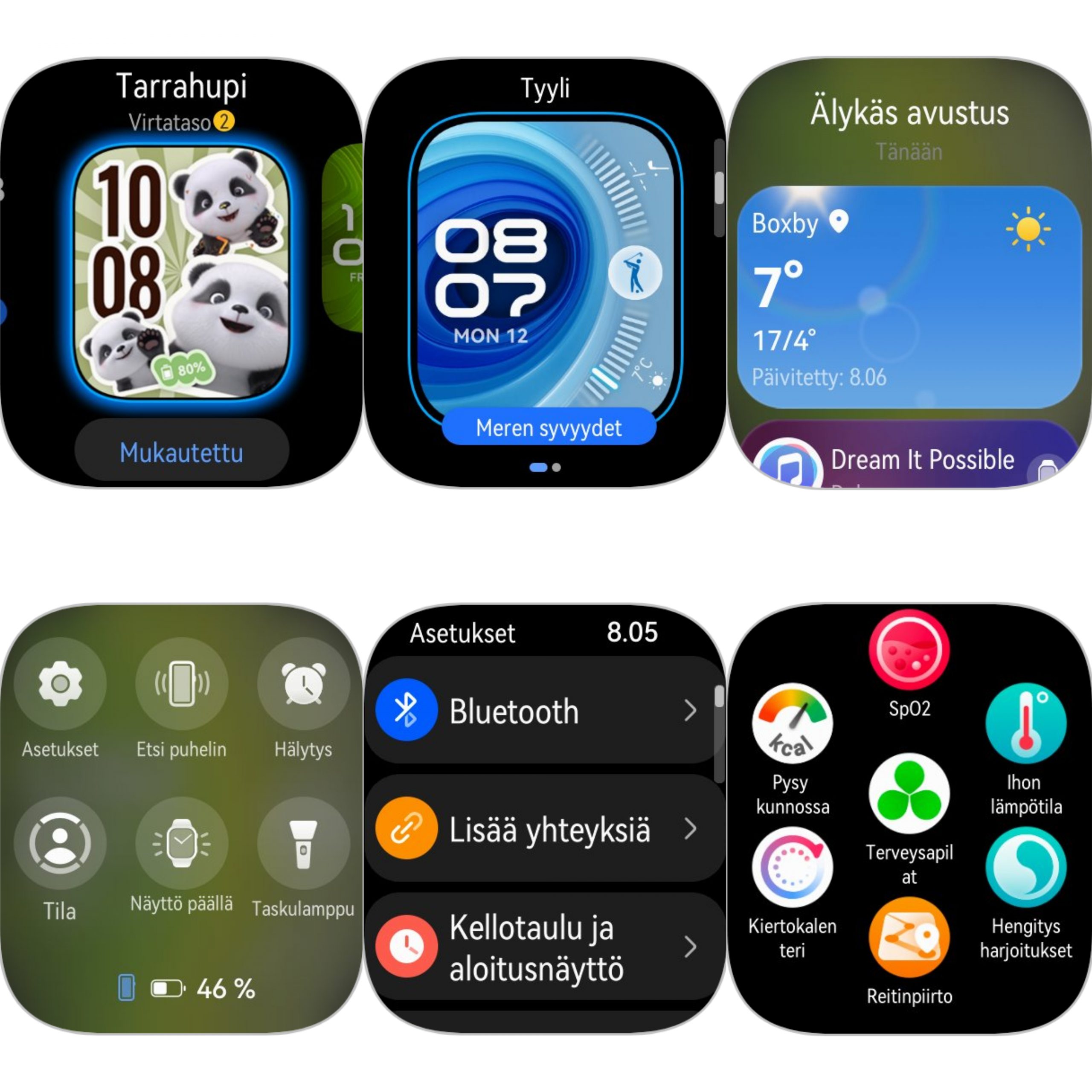 Huawein älykello-ohjelmiston korosteväri päivittyi parisen vuotta sitten sinisestä keltaiseksi, ja samalla kuvakkeita virtaviivaistettiin hieman. Käyttökokemus on kuitenkin ennallaan kruunupainikkeen avatessa oletuksena ruudukkomaisen, painiketta pyörittämällä selattavan valikon ja pyyhkäisyeleiden viedessä kotinäytöltä muun muassa terveys-, sää- ja musiikkinäkymiin.