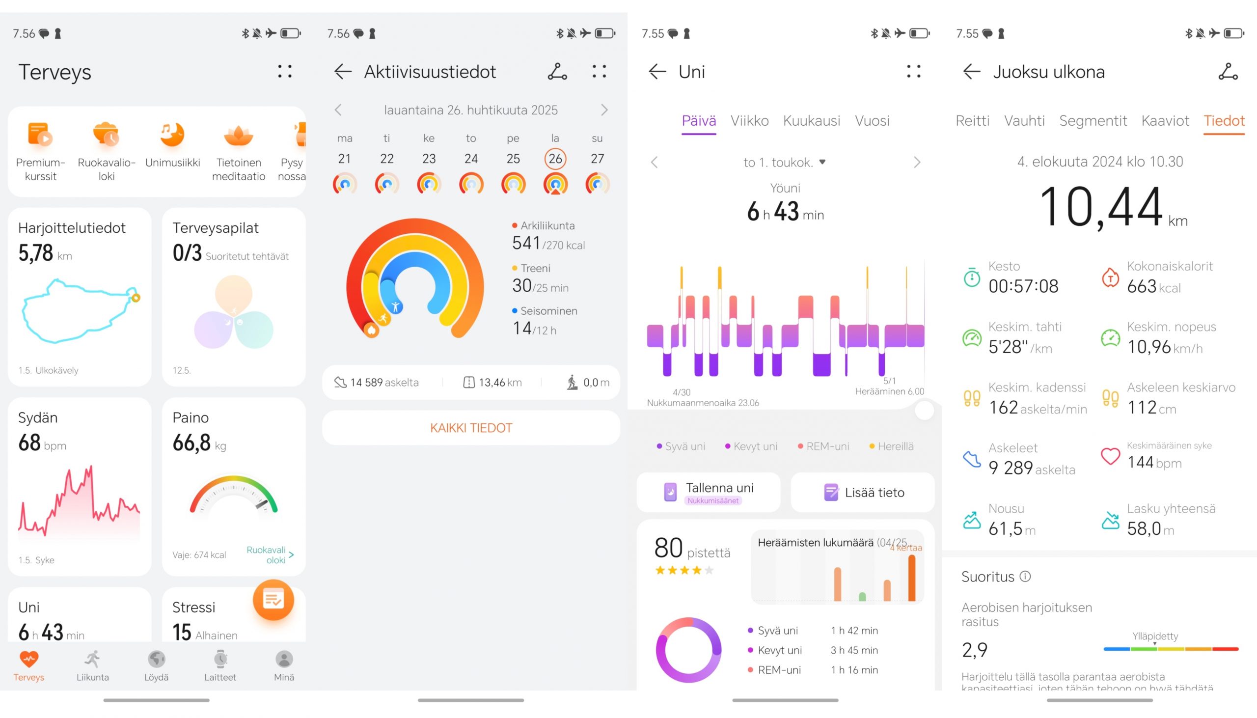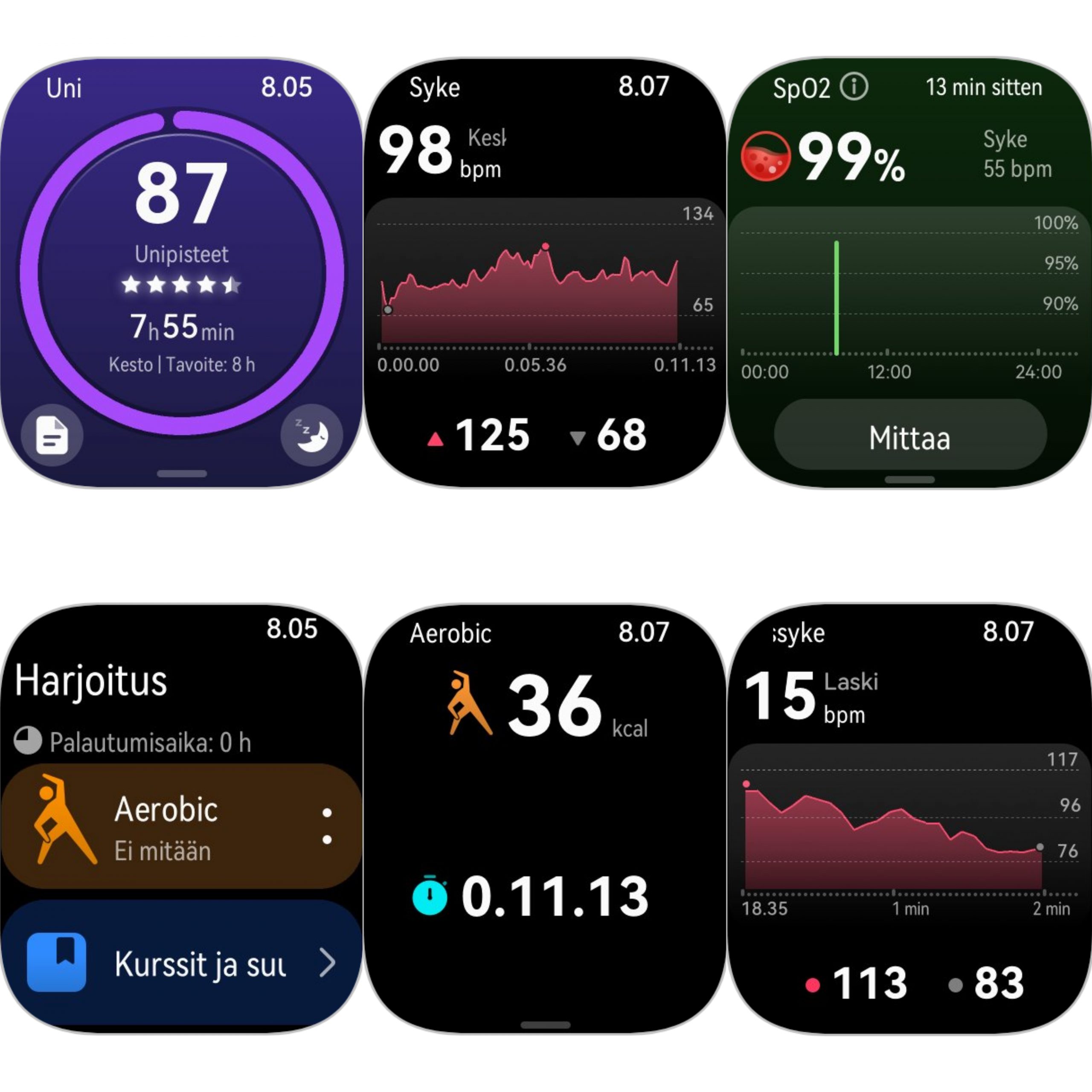Treenitiedot ovat tarkasteltavissa heti tuoreeltaan ranteessa tai älypuhelimen Huawei Health -sovelluksen kautta. Tietueet ovat monipuolisia ja värikkäitä, mutta silti helppolukuisia, minkä ohella selkeästi kirjoitetut, suomenkieliset opasteet auttavat niiden tulkitsemisessa.