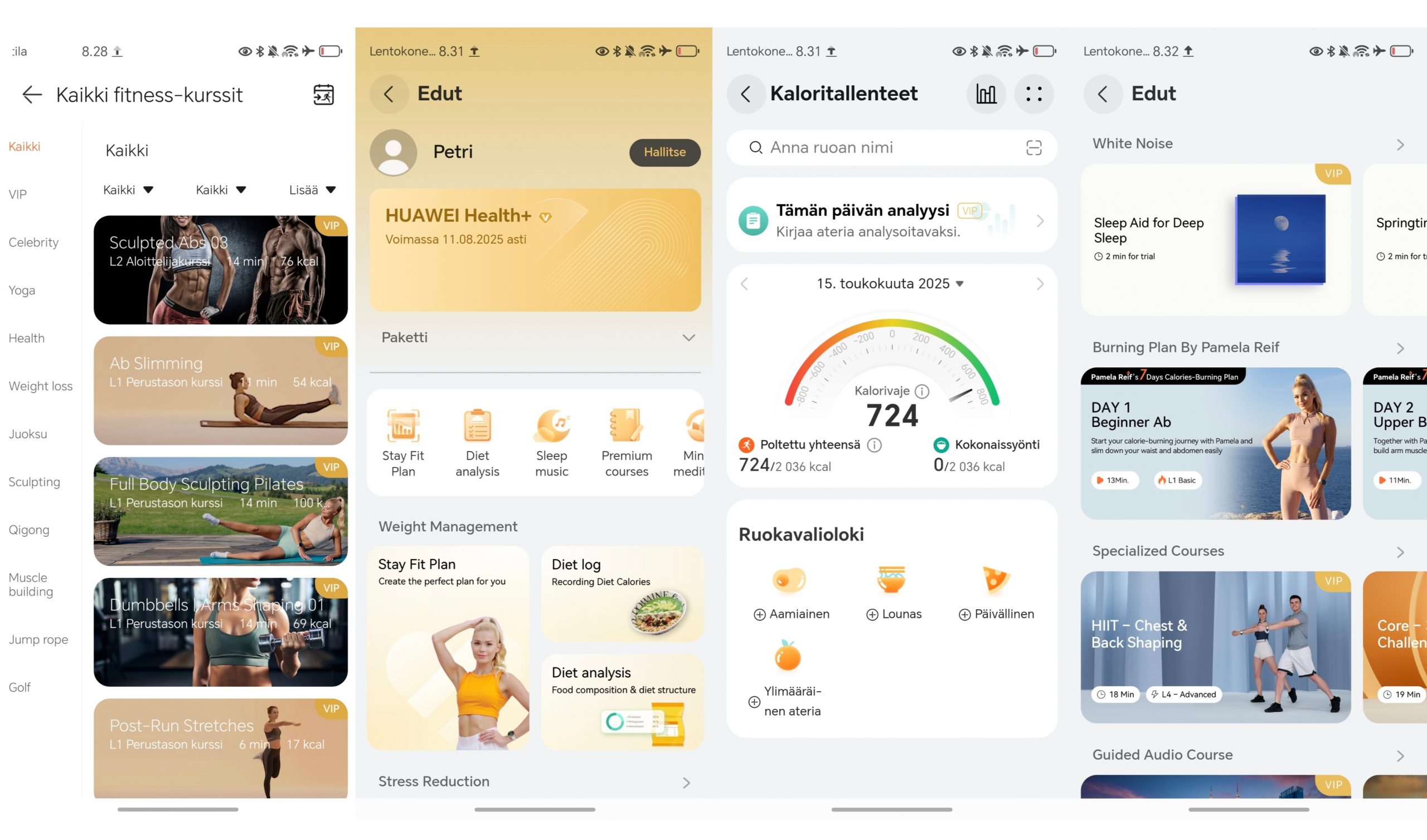Kaikki Huawei Watch Fit 4 Pron toiminnot ovat käytettävissä maksutta. Huawei Healthissa on kuitenkin tarjolla myös kuukausi- tai vuositilauksena erillinen plus-jäsenyys, jonka kautta saa pääsyn vaikkapa satoihin varta vasten tehtyihin treenivideoihin. Myös ilmaisvalikoimaan kannattaa ehdottomasti tutustua monipuolisessa sovelluksessa.