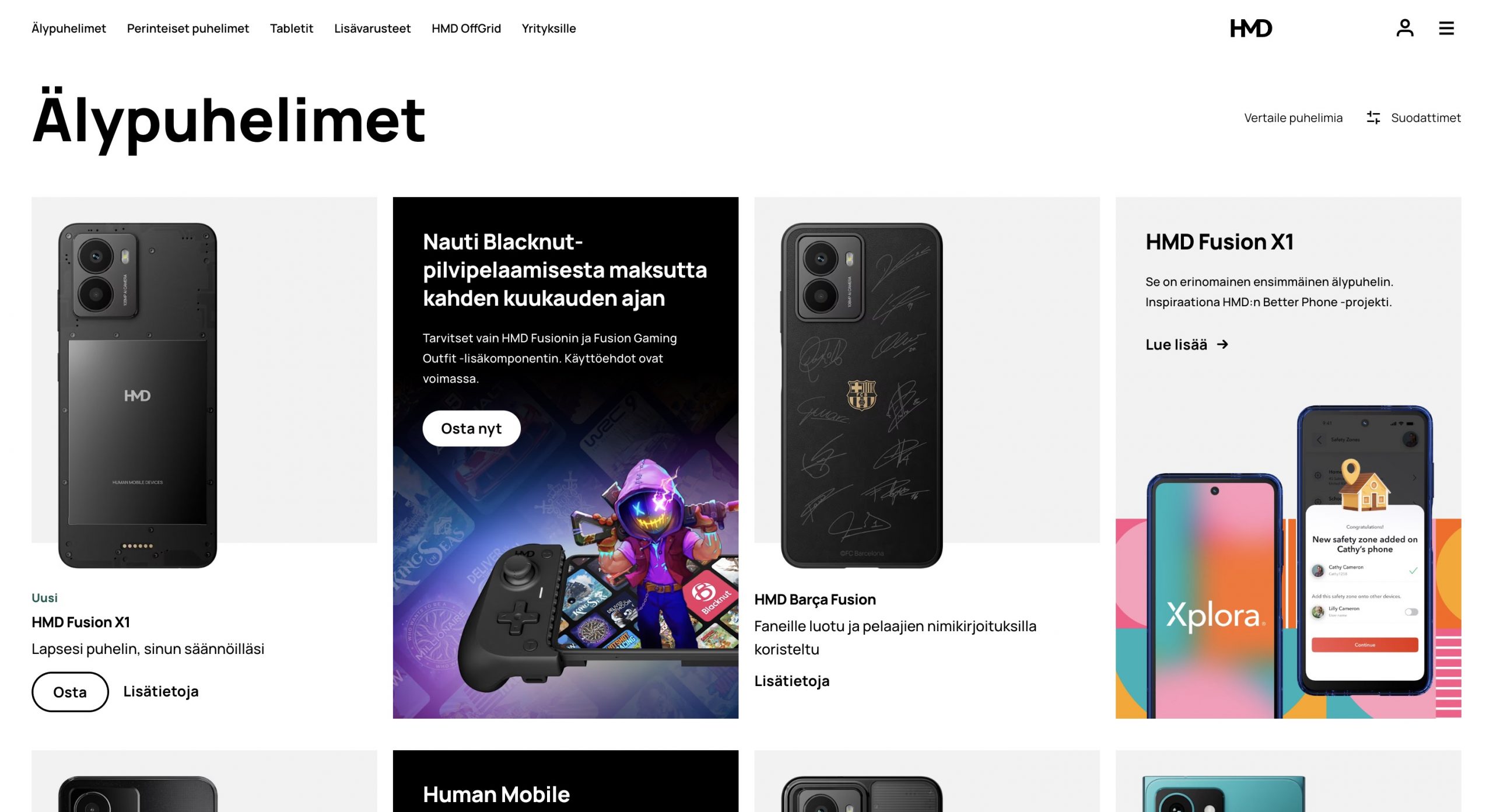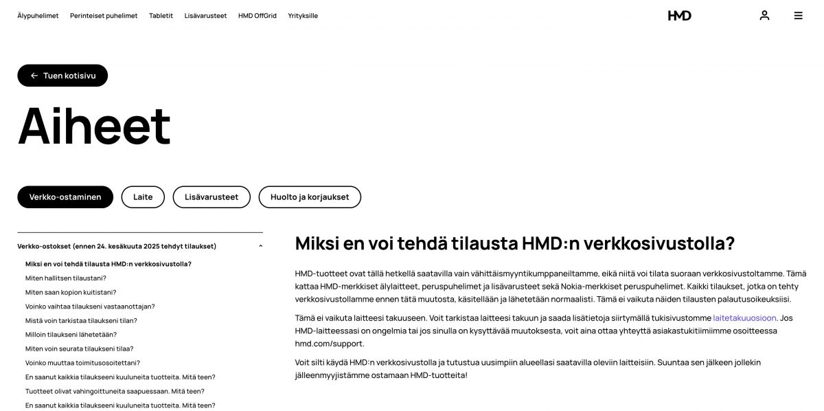 ”HMD-tuotteet ovat tällä hetkellä saatavilla vain vähittäismyyntikumppaneiltamme, eikä niitä voi tilata suoraan verkkosivustoltamme. Tämä kattaa HMD-merkkiset älylaitteet, peruspuhelimet ja lisävarusteet sekä Nokia-merkkiset peruspuhelimet. Kaikki tilaukset, jotka on tehty verkkosivustollamme ennen tätä muutosta, käsitellään ja lähetetään normaalisti. Tämä ei vaikuta näiden tilausten palautusoikeuksiisi”, kertoo HMD tukisivuillaan julkaistussa tiedoksiannossa kysymykseen, miksei HMD:n verkkosivustolla voi tehdä tilausta.