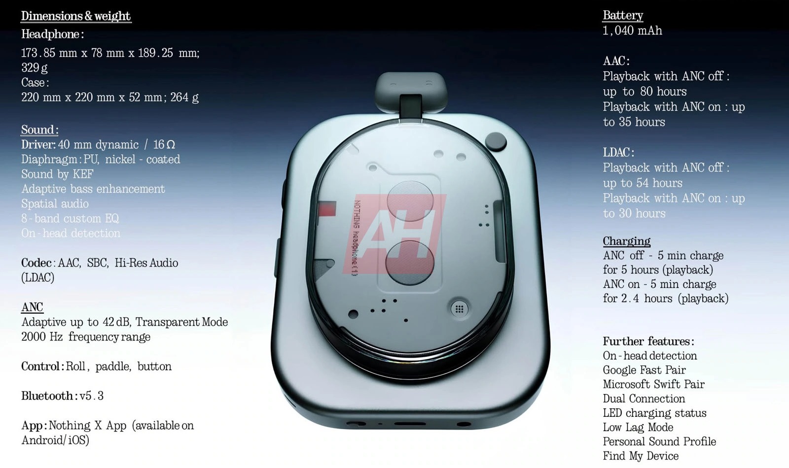Nothing Headphone (1) on varustettu 1 040 milliampeeritunnin akulla.