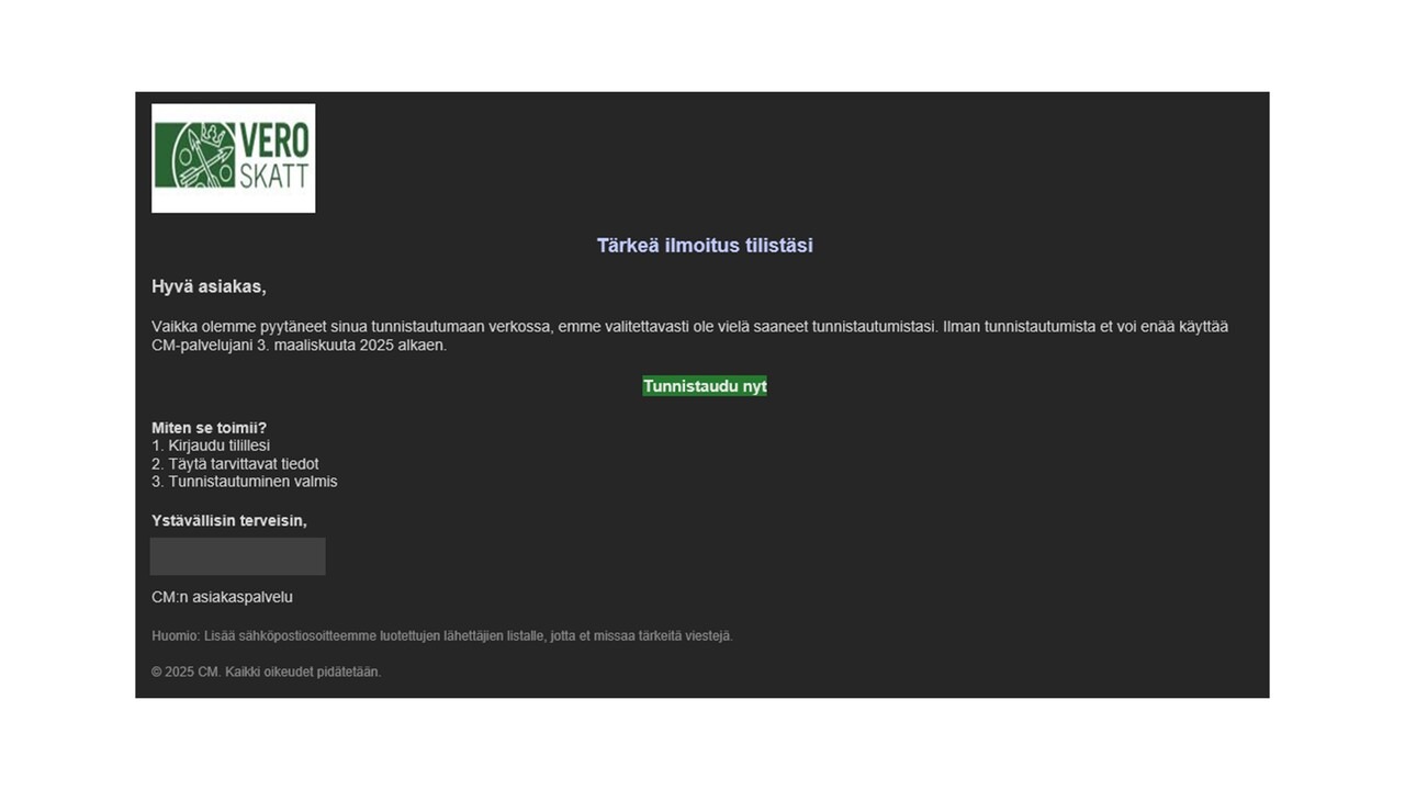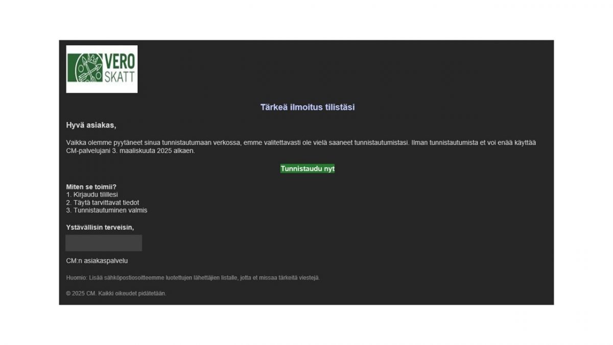 Verohallinnon nimissä leviää puolestaan sähköpostihuijausviestejä, joissa pyydetään vastaanottajaa tunnistautumaan Veron palveluun. Tyypillisesti viesteissä on maksutietoja kalastelevalle sivulle linkki.