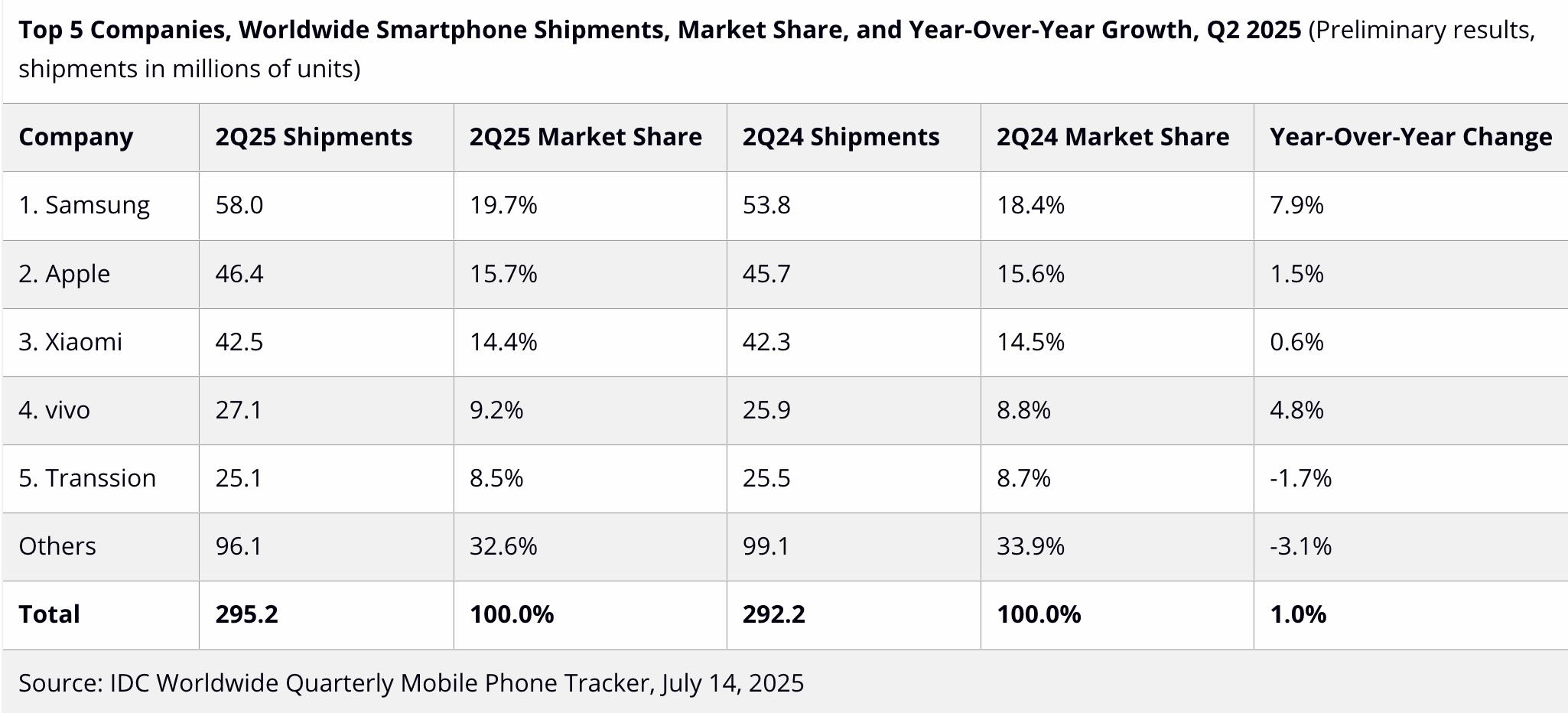 IDC:n tilastojen mukaan Samsung vankisti markkinajohtajuuttaan vuoden 2025 toisella neljänneksellä. Samsungin markkinaosuus oli 19,7 prosenttia verrattuna vuodentakaiseen 18,4 prosenttiin. Applen markkinaosuus nousi niukasti 15,6 prosentista 15,7 prosenttiin. Samsung kasvatti toimituksiaan 7,9 prosentilla ja Apple 1,5 prosentilla vuodentakaisesta.