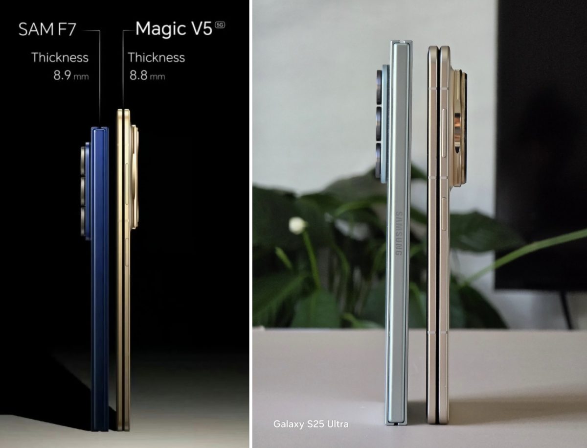 Universe Ice -nimimerkillä esiintyvä tunnettu vuotaja vertaili julkaisemallaan videolla Samsungin ja Honorin viimeisimpiä taittuvanäyttöisiä puhelimia rinnakkain. Puhelinten päälle asetettu kortti ja pingispallo paljastavat selvästi, kuinka Samsung Galaxy Z Fold7 on vertailussa ohuempi kuin Honor Magic V5.