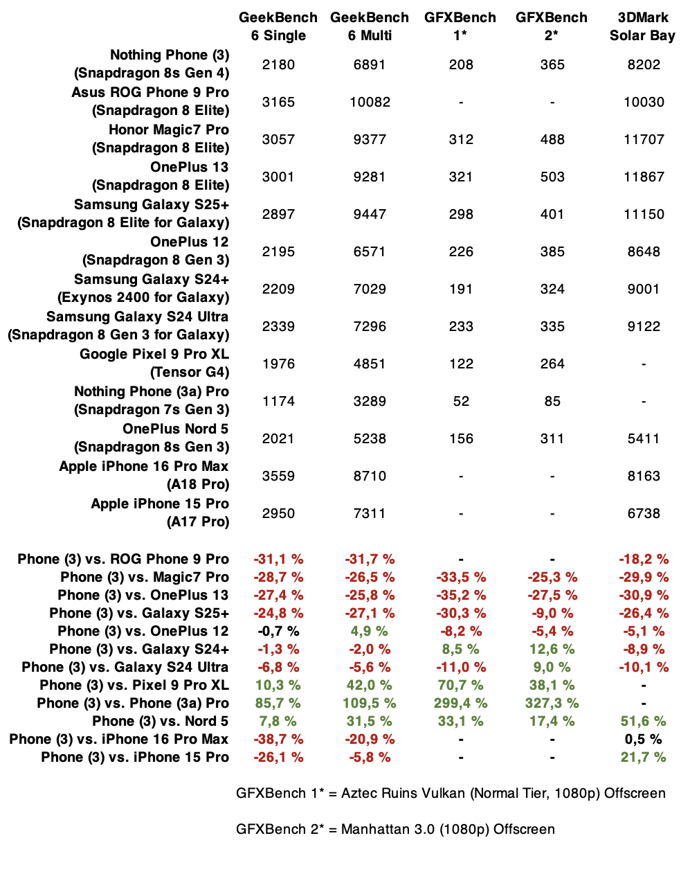 Snapdragon 8 Elite -puhelimiin, kuten OnePlus 13 tai Samsungin Galaxy S25 -sarjalaiset, verrattuna Nothing Phone (3) jää jälkeen niin peruslaskennassa kuin graafisessa suorituskyvyssä karkeasti noin 30 prosentilla. Samalla suorituskyky on lähellä edellisen sukupolven huippupuhelimia.