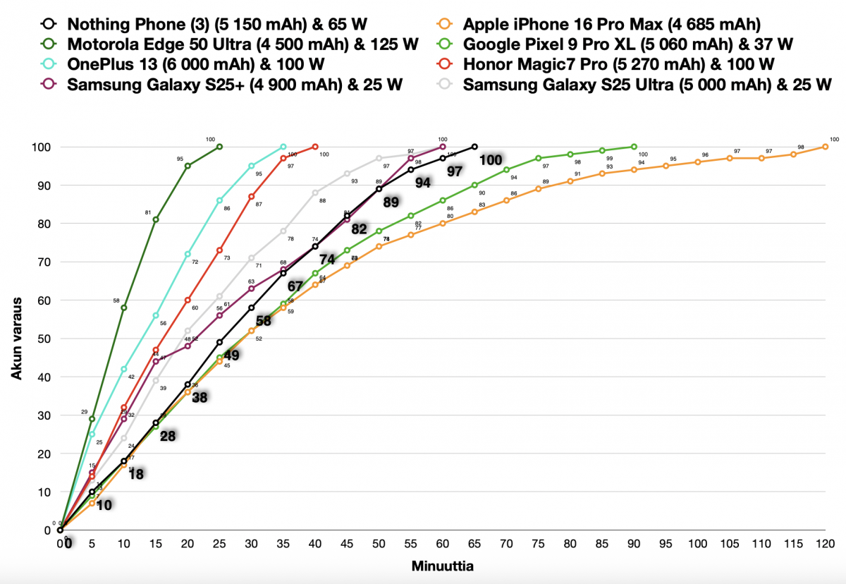 Nothing Phone (3) ei ole lähelläkään nopeimmin latautuvien puhelinten joukossa, mutta pikalataus täyttänee kuitenkin useimpien tarpeet.