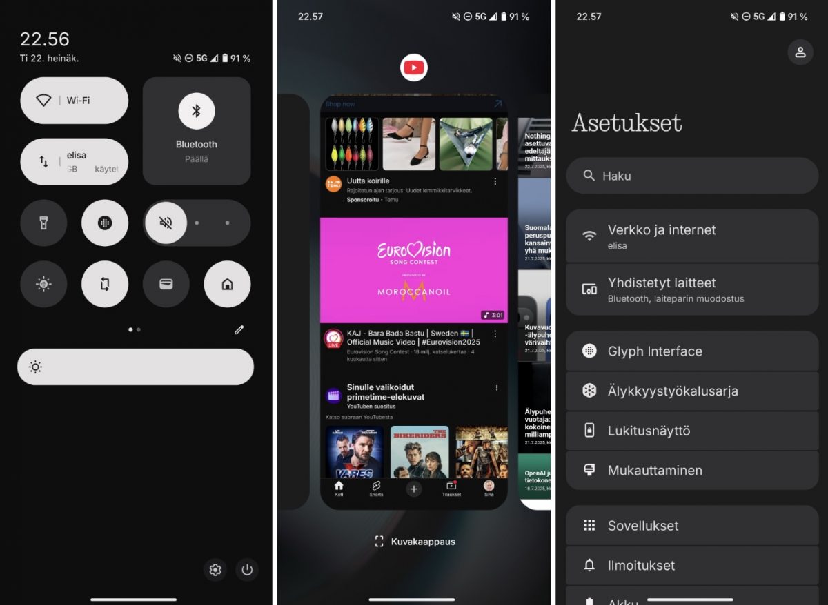 Nothingin ohjelmisto eli Nothing OS on monilta osin lähellä vakio-Androidia mitä tulee esimerkiksi pika-asetusnäkymään, avoinna olevien sovellusten moniajonäkymään tai asetuksiin, mutta pienellä Nothing-twistillä. Nothing toteuttaa myös ohjelmiston puolella omaa erottuvaa tyyliään onnistuneella tavalla.