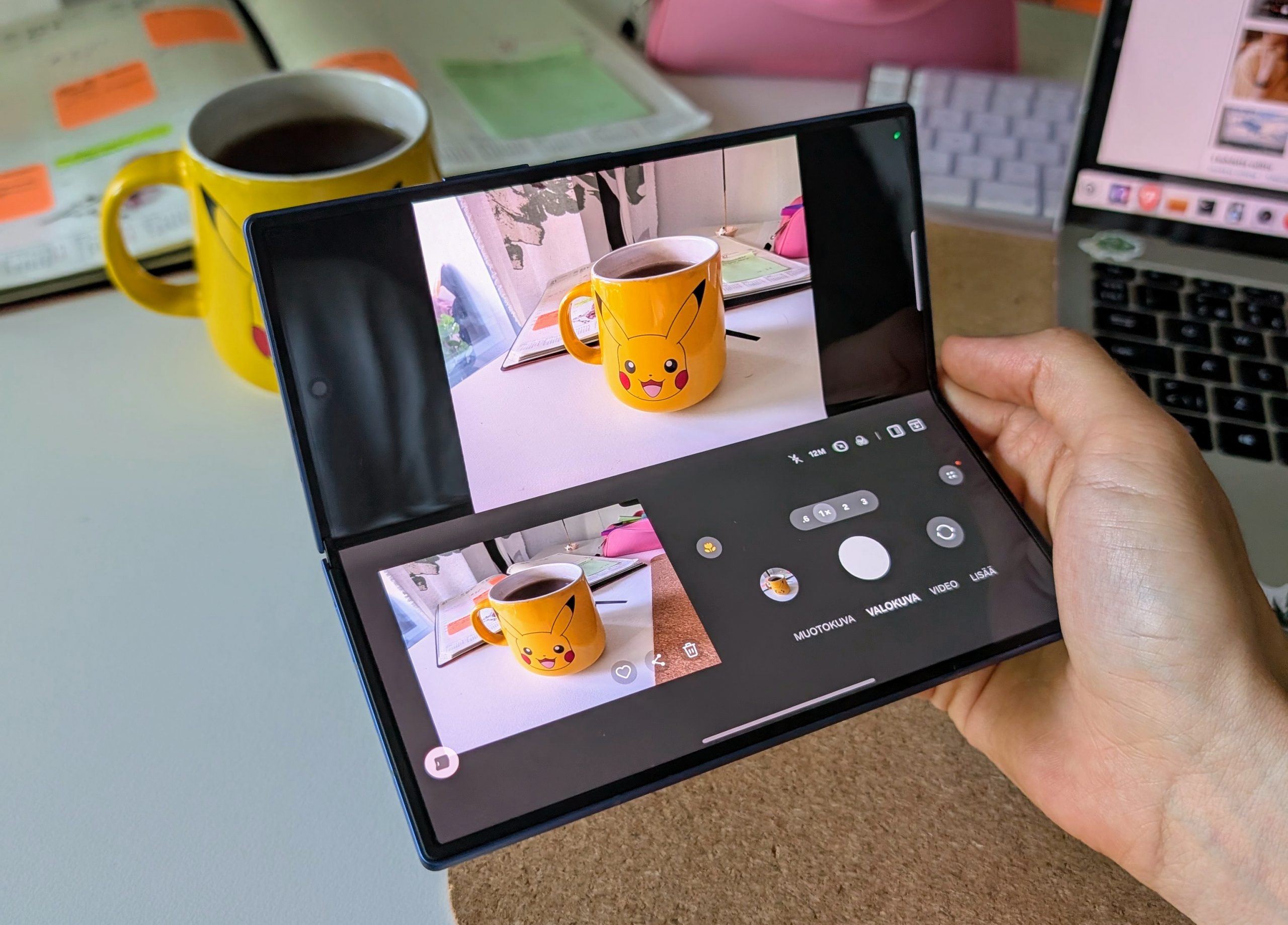 Taittuva rakenne mahdollistaa valokuvaamisen monella tavalla toimien vaikkapa kätevänä kuvaustukena – jos kohta tällöin älypuhelin on asetettava esimerkiksi pöydälle kansinäyttö alaspäin. Kansinäyttöä voi käyttää myös peilin tavoin etsimenä ja napsia omakuvia erinomaisella 200 megapikselin pääkameralla.