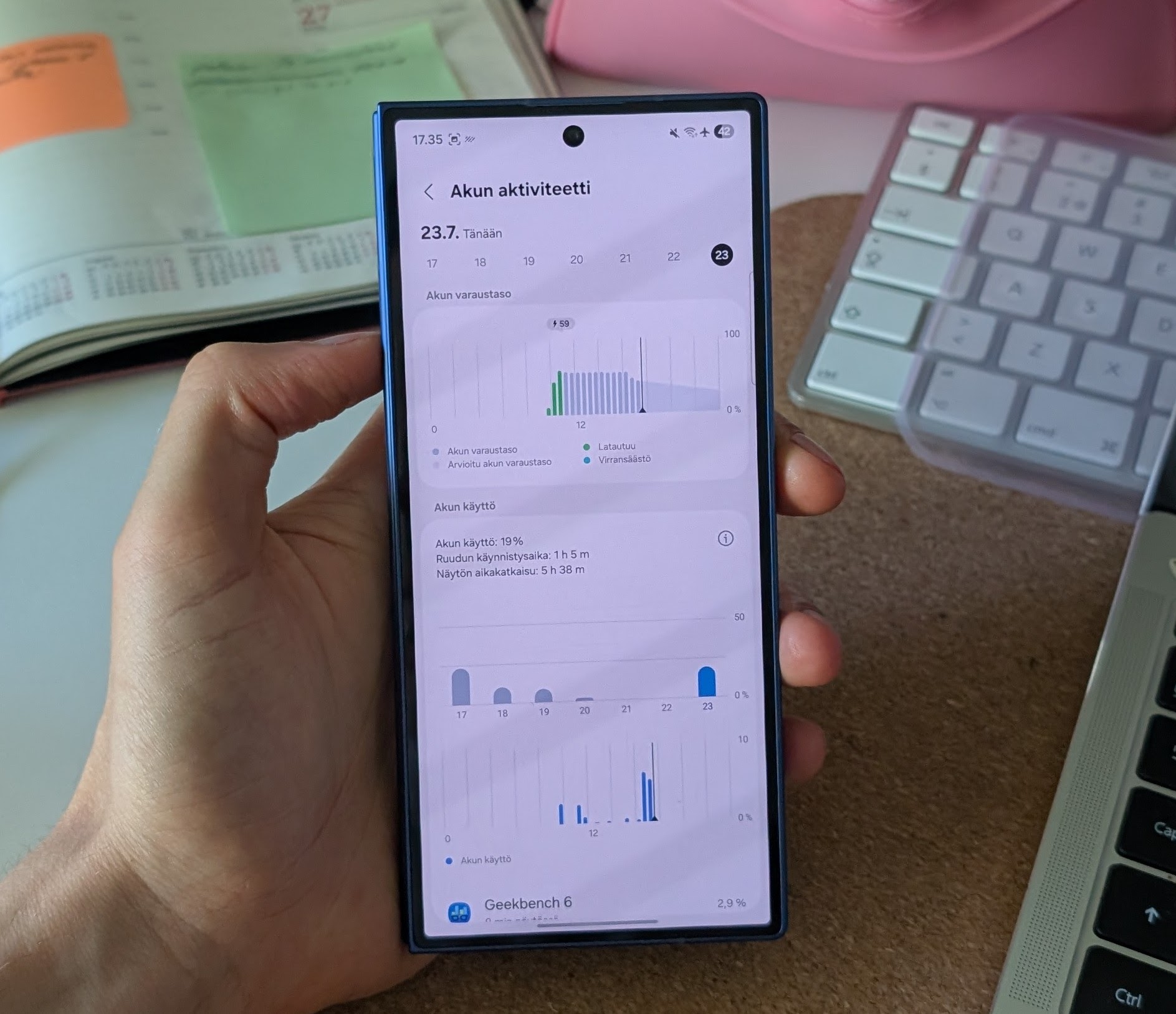 Kaisinäyttöisen puhelimen käyttötottumuksilla on merkittävä vaikutus akunkestoon. Mitä enemmän nauttii sisällöistä päänäytöllä, sitä enemmän virtaa kuluu, kansipaneelin käyttäessä vähemmän virtaa. Valokuvaaminen vaikuttaisi kuluttavan akkua hieman tavanomaista nopeammin, kun taas suoratoistosisältöjen katselua Galaxy Z Fold7 tuntui kestävän ilahduttavan hyvin.