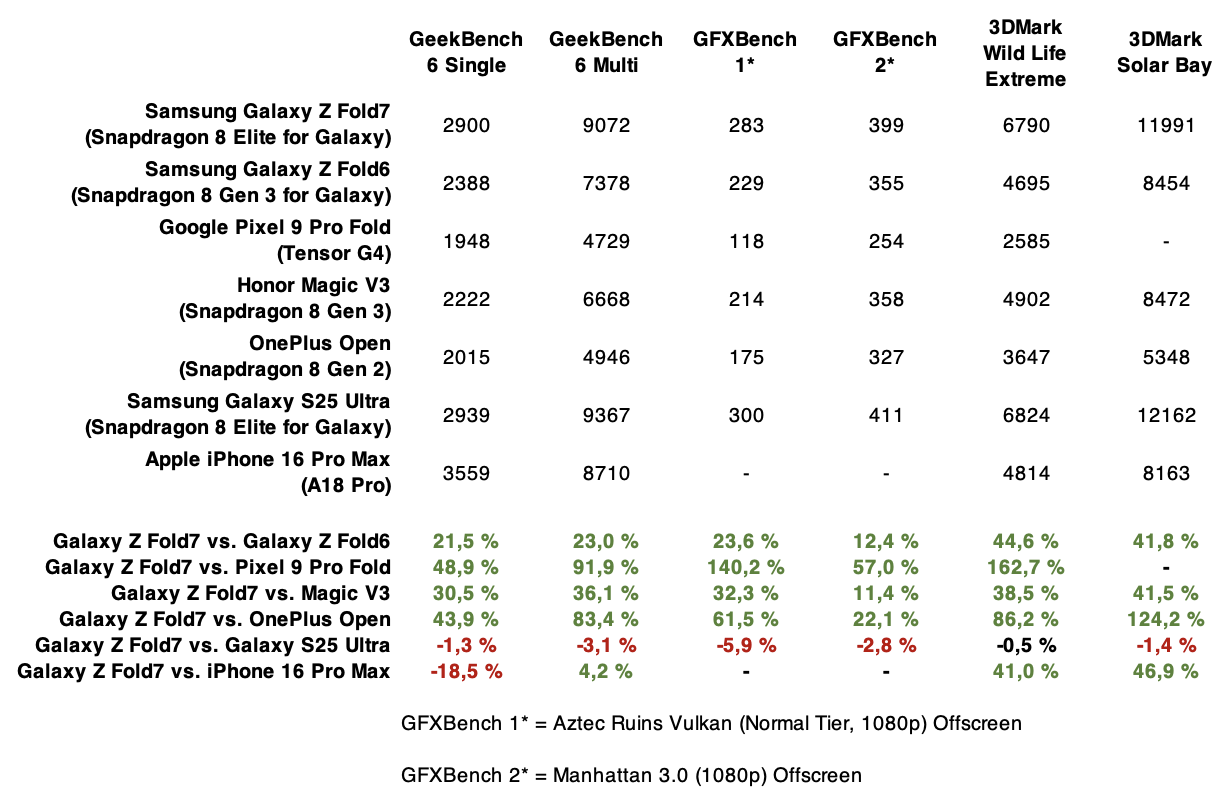 Samsung Galaxy Z Fold7 soveltuu kahden erinomaisen näyttönsä ansiosta loistavasti kaikenlaiseen käyttöön, olipa kyse sitten sosiaalisesta mediasta, verkkoselailusta tai työskentelystä. Myös tehoja riittää, ja Qualcomm Snapdragon 8 Elite for Galaxyn voimin Galaxy Z Fold7 kellottaa testeissä oivallisia tuloksia, vaikka todennäköisesti äärirajoille viedyn rakenteen heikommasta jäähdytyksestä johtuen marginaalisesti Galaxy S25 Ultran tehoista jääkin.
