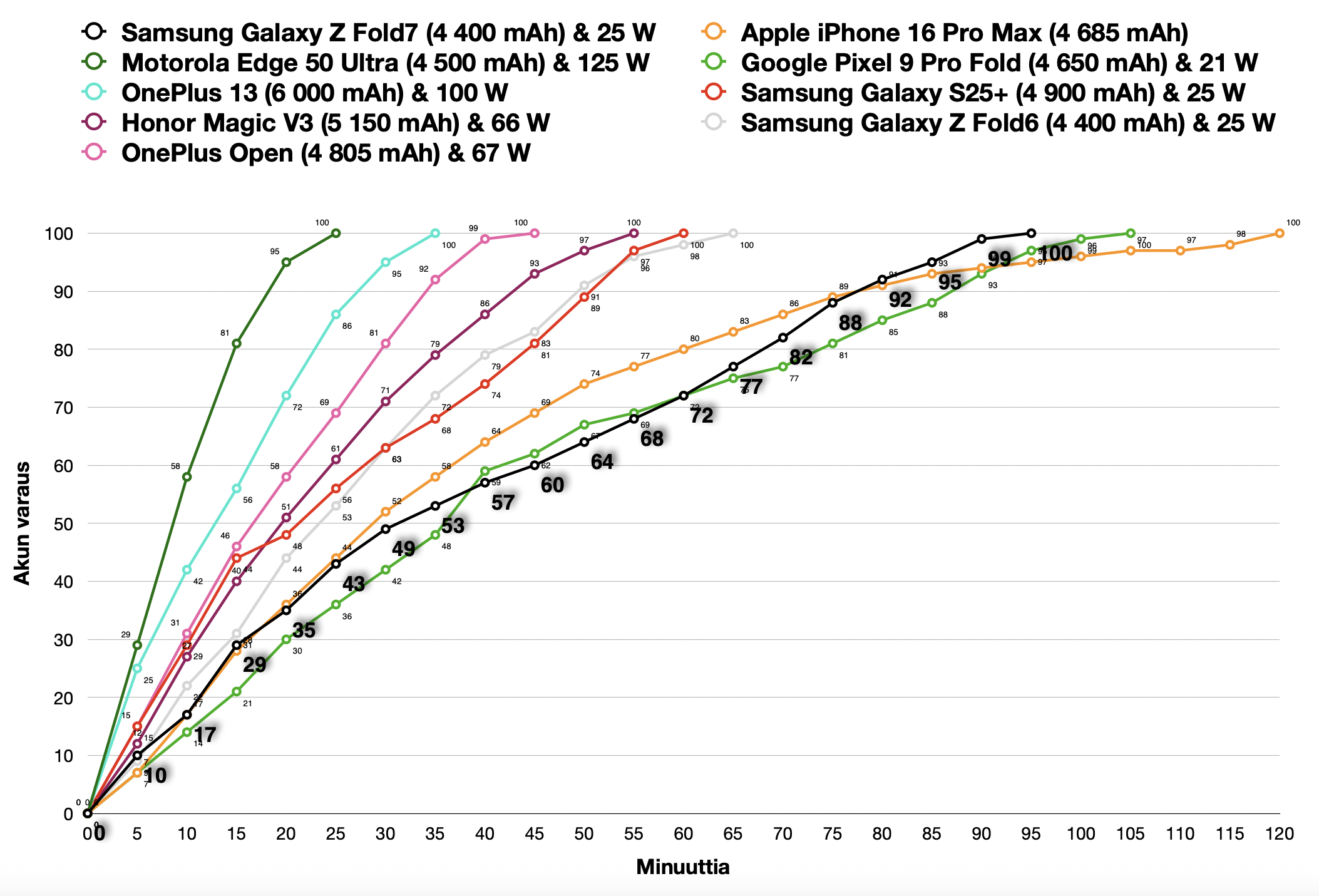 Samsung Galaxy Z Fold7 tukee nykymittapuulla varsin maltillista 25 watin lataustehoa jääden näin jopa valittujen Galaxy A -sarjalaisten taakse. Akku latautui puolilleen noin 30 minuutissa täyden latauksen viedessä osapuilleen 90 minuuttia. Mielenkiintoisesti testissämme lataus oli jopa selvästi hitaampi kuin edeltävällä Galaxy Z Fold6:lla.