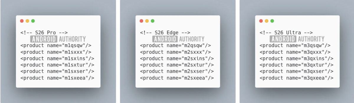 Ohjelmistosta on löytynyt maininnat M1-, M2- ja M3-laitteista, joiden nimiksi mainitaan Galaxy S26 Pro, Galaxy S26 Edge ja Galaxy S26 Ultra.