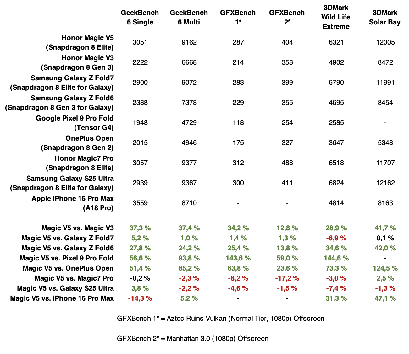 Taittuvanäyttöisille puhelimille tyypillisellä tavalla Honor Magic V5 ei suorituskykytesteissä yllä aivan aivan kärkeen, mutta kellottaa kuitenkin erinomaisen vertailukelpoisia tuloksia huippupuhelinten joukossa. Alla olevat testitulokset on saavutettu suorituskykytilassa, joka on erikseen aktivoitavissa asetuksista. Tila on oletuksena pois päältä, sillä se kasvattaa virrankulutusta, ja ilman sitä suorituskyky laskee noin 10-15 prosenttia hieman tapauksesta riippuen.