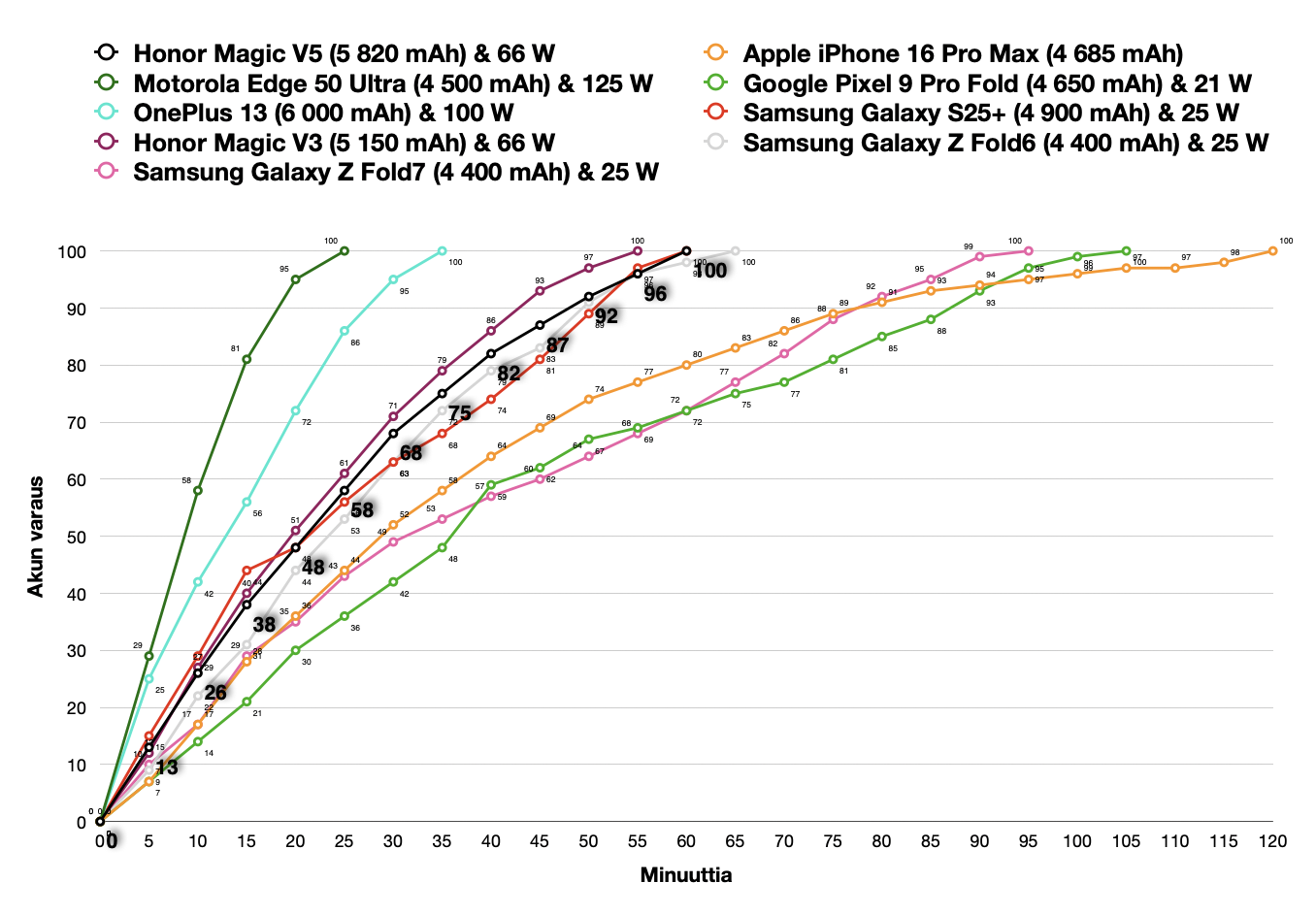 Langallisella pikalatauksella lataus tyhjästä täyteen kesti jotakuinkin 55 minuuttia, ja varttitunnissa virtaa kertyi noin 38 prosenttia.