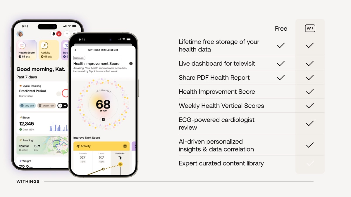Withings+ sisältää Withings Health Assistantin, uuden tekoälypohjaisen avustajan, joka antaa käyttäjälle terveysneuvontaa, edistyneet mittarit ja tulokset, joihin lukeutuu Withingsin kehittämä Vitality Indicator.