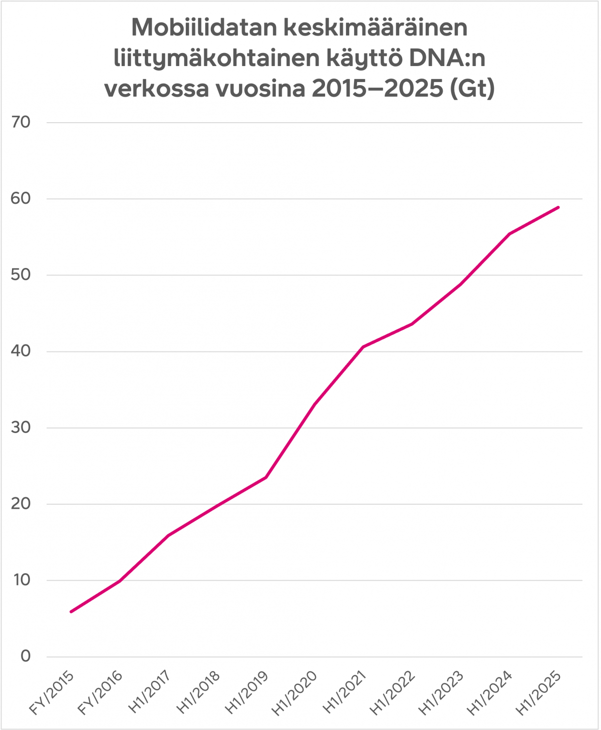 Vuoden 2025 ensimmäisellä puoliskolla DNA:n asiakkaat käyttivät keskimäärin 58,9 gigatavua mobiilidataa kuukaudessa. Vuotta aiemmin vastaava luku oli 55,4 gigatavua. Liittymäkohtainen datamäärä on kasvanut vuodessa siis noin 6 prosenttia. Kolmen vuoden aikana kasvua on tullut jopa 35 prosenttia, sillä vielä tammi–kesäkuussa 2022 vastaava luku oli 43,6 gigatavua, ja vuonna 2015 saavutetusta 5,9 gigatavusta liittymäkohtaisen mobiilidatan määrä on noin kymmenkertaistunut.