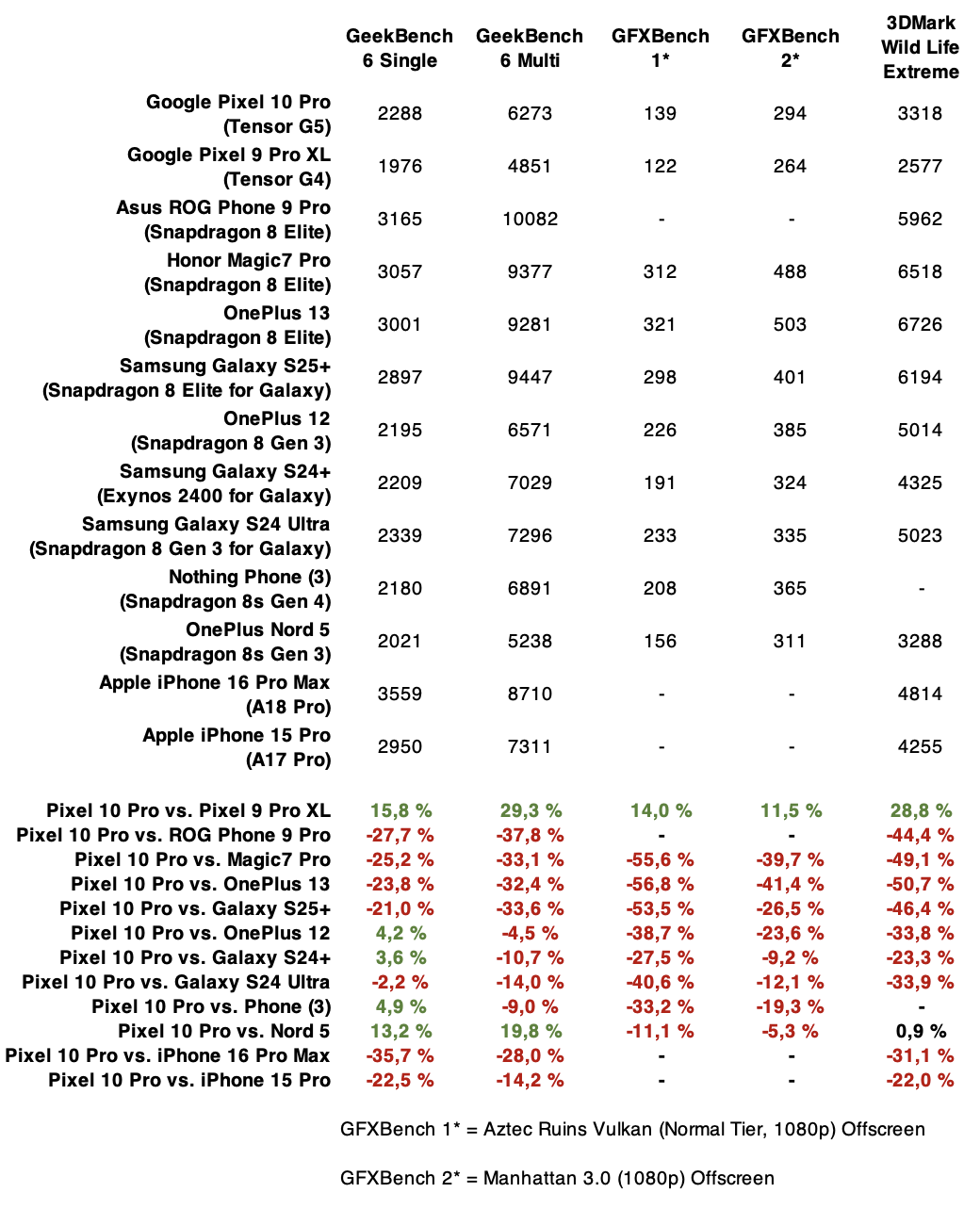 Parannuksista huolimatta kilpailevista huippupuhelimista graafisessa suorituskyvyssä Pixel 10 Pro jää jälkeen jopa 40-60 prosenttia, ja tehokkaimmat keskihintaluokan puhelimetkin, kuten vaikkapa OnePlus Nord 5, ovat edellä Pixel 10 Prota graafisessa suorituskyvyssä.
