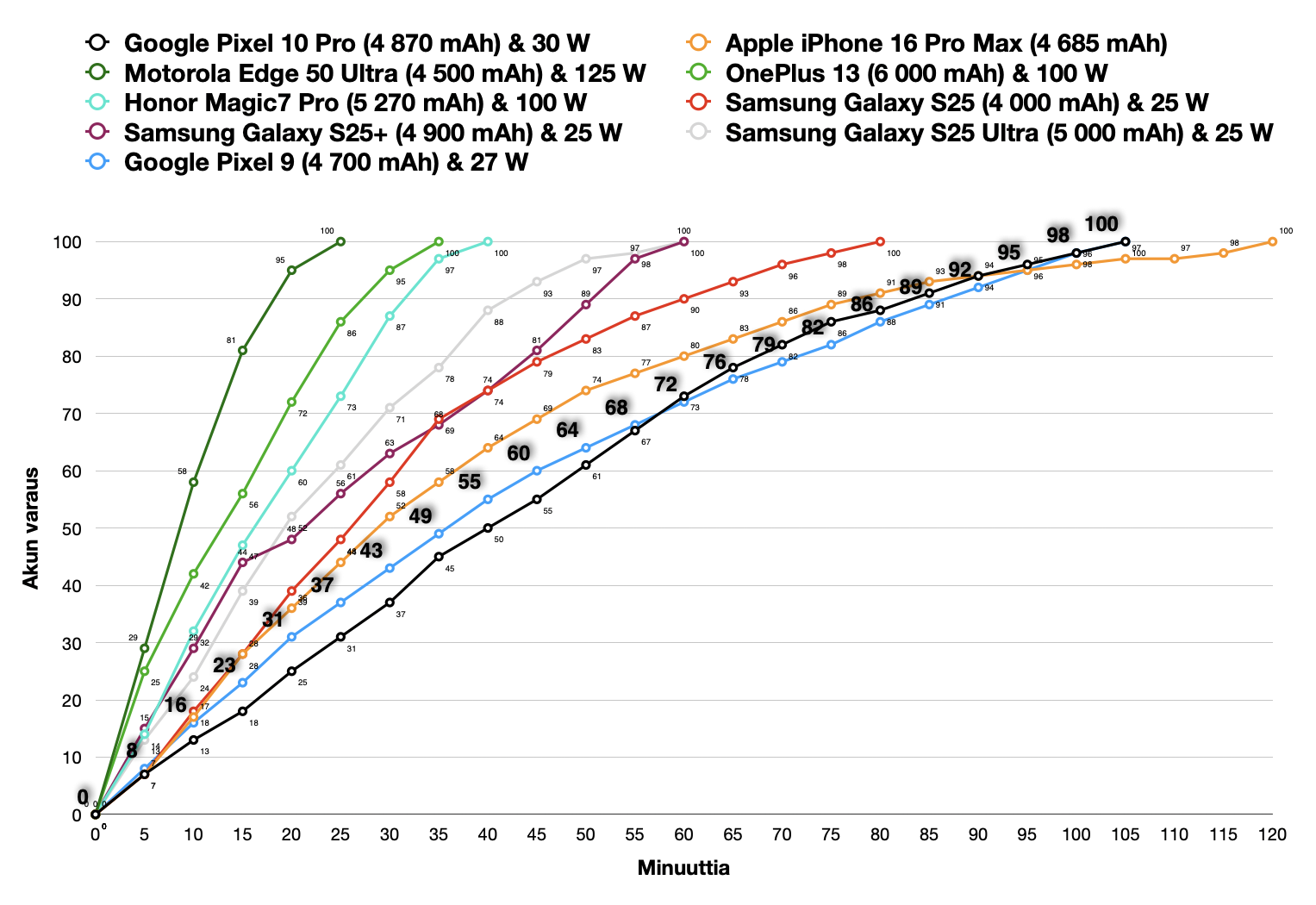 On vaikeaa arvioida, mikä virtaa kuluttaa, mutta Googlen älypuhelimet ovat akunkestossa mitattuna hieman esimerkiksi Samsungin vastaavia jäljessä vuonna 2025. Kenties yhtiön oma Tensor G5 -piiri kuluttaa virtaa edelleen Snapdragon-verrokkejaan enemmän?