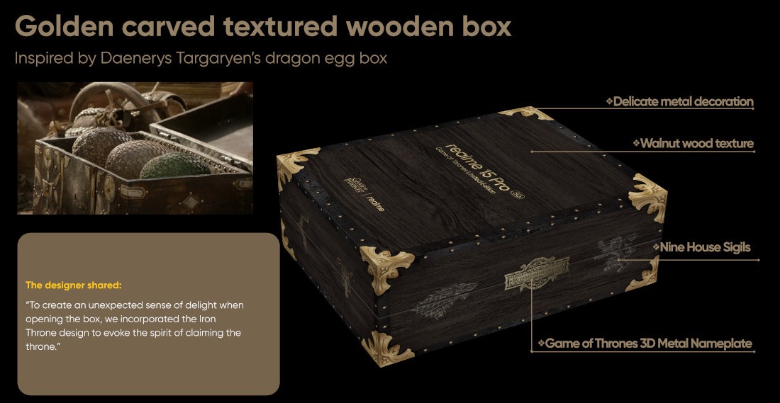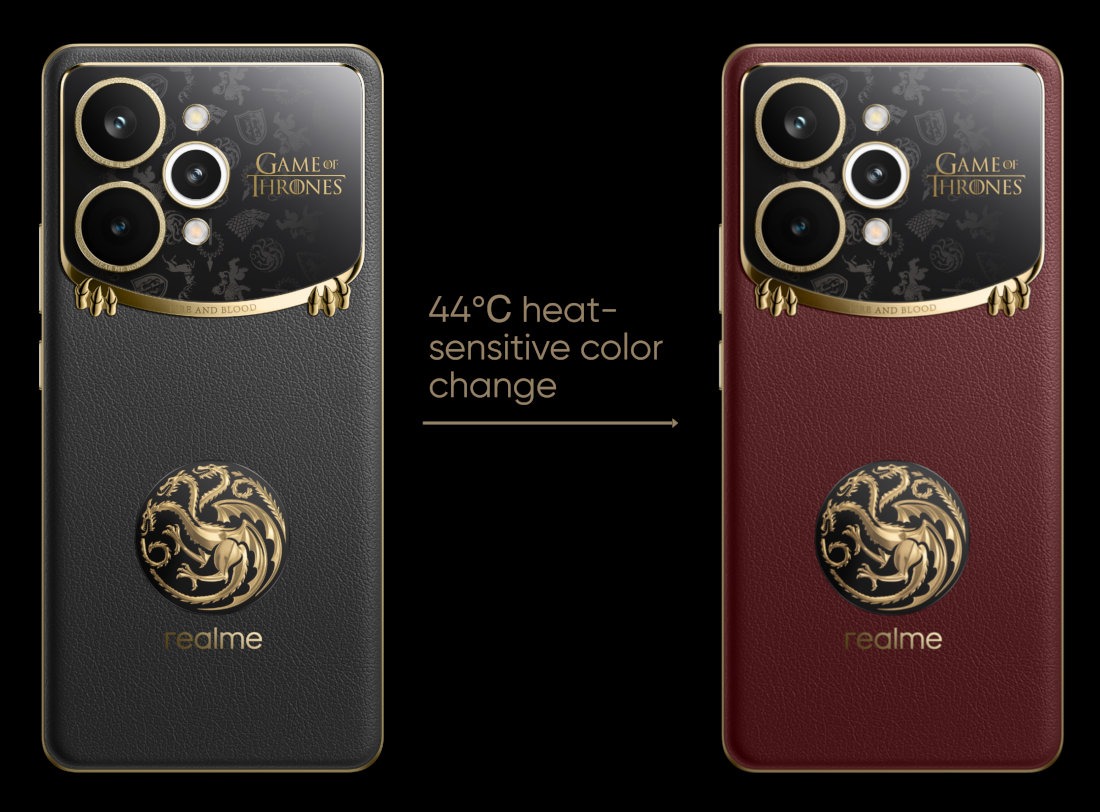 Realme 15 Pro Game of Thrones Limited Edition -erikoisversiossa on musta tekotakapinta, joka kuitenkin reagoi lämpöön: yli 44 celsiusasteen lämpötilassa takapinnan väri muuttuu punaiseksi. Takapintaan on upotettu Targaryenin vaakuna, ja myös kameroiden yhteydestä löytyy useita sarjaan liittyviä yksityiskohtia, kuten tekstit Winter is Coming ja Hear me Roar sekä kullanväinen Fire and Blood -reunus lohikkäärmeen kynsikoristeilla. Runko on viimeistelty kultavärillä.