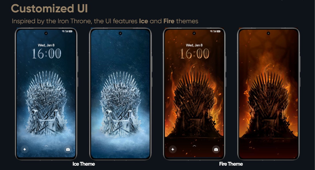 Realme 15 Pro Game of Thrones Limited Editionin käyttöliittymään Realme on lisännyt Game of Thrones -teemoja ja kuvakkeita. Valittavissa ovat jää- tai tuliteema.
