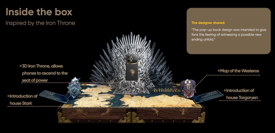 Erikoisversion myyntipakkauksesta löytyy teeman mukaisia keräilyesineitä: esimerkiksi valtaistuimen mallinen puhelinteline, Hand of the Kingin rintaneulaa mukaileva SIM-korttityökalu, valossa sisältönsä paljastavat paperit sekä Westerosin karttakuvituksia, tarroja ja postikortteja. Puhelimen mukana toimitetaan myös 80 watin pikalaturi.