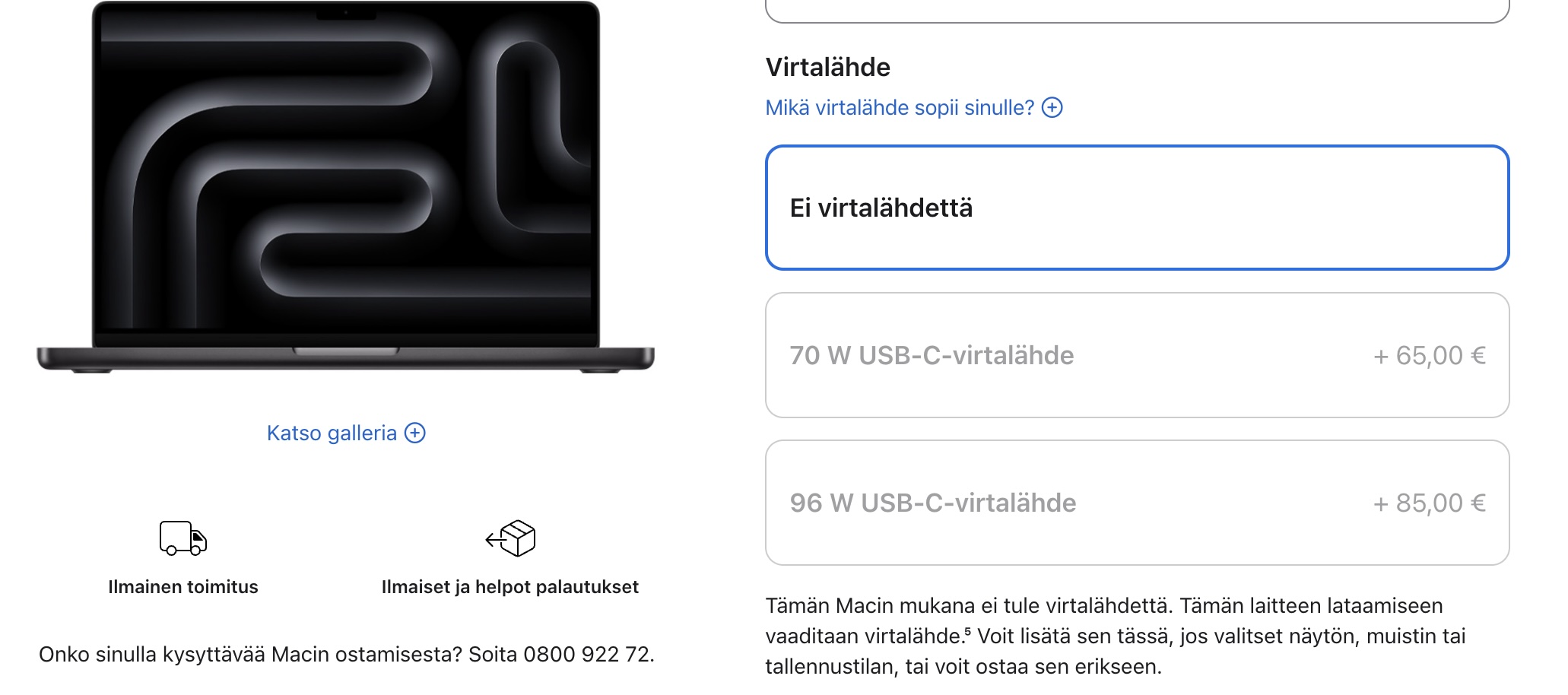 Uusi MacBook Pro on ensimmäinen Mac-läppäri, jonka mukana ei enää tule virtalähdettä eli laturia. Sen sijaan Apple tarjoaa laitteen kaveriksi ostettavaksi 65 eurolla 70 watin laturia ja 85 eurolla tehokkaampaa 96 watin laturia, joka mahdollistaa nopeamman pikalatauksen.
