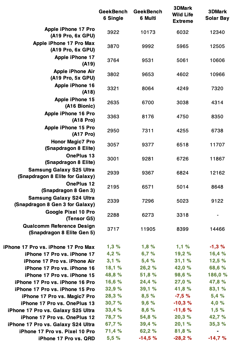 Yhden ytimen keskussuorittimen suorituskyvyssä iPhone 17 Pro ja Pro Max voittavat selvästi, noin 30 prosentilla, Snapdragon 8 Elitellä varustetut Android-huippupuhelimet. Myös useamman ytimen pisteissä iPhonet ovat vajaat 10 prosenttia edellä. Graafisessa suorituskyvyssä puolestaan tilanne on kaksijakoinen, mutta yleisesti voidaan sanoa iPhone 17 Pro -kaksikon jäävän hieman jälkeen Snapdragon 8 Elite -puhelimista, vaikka 3DMark Solar Bayssa ne edelle ylsivätkin.