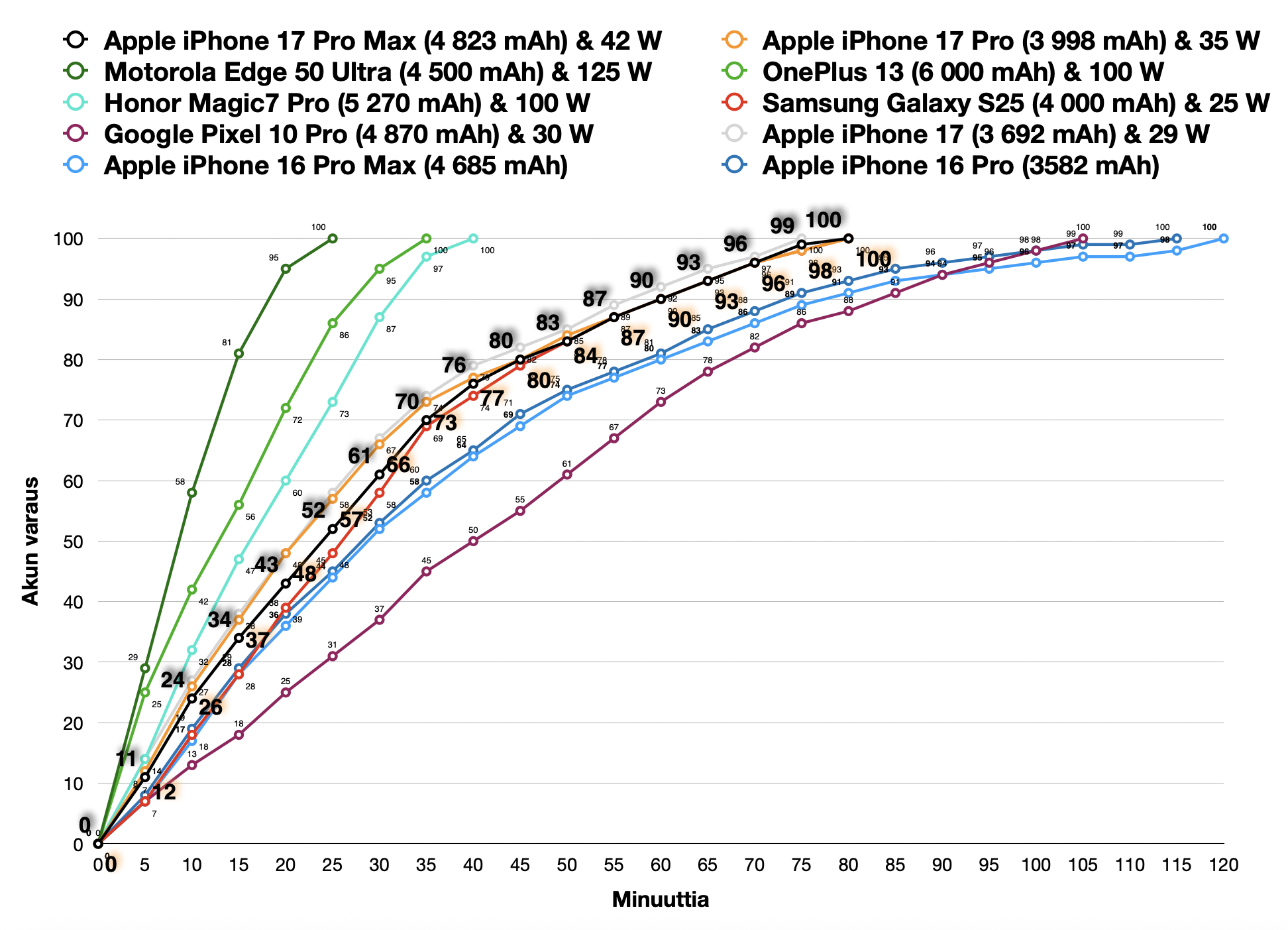 iPhone 17 Pro Max puolestaan latautui 20 minuutissa 43 prosentin, 30 minuutissa 61 prosentin ja 45 minuutissa 80 prosentin varaukseen verrattuna iPhone 16 Pro Maxin 36, 52 ja 69 prosenttiin.