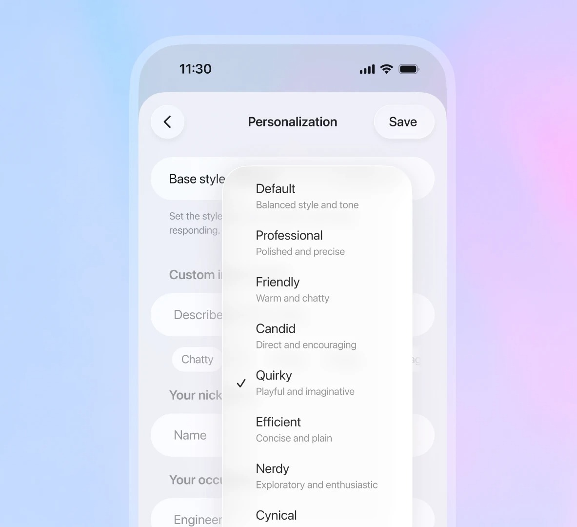 GPT-5.1-mallit tarjoavat jälleen oletuksena enemmän luonnollisia ja keskustelunomaisia vastauksia ”kylmien” datamaisten vastausten sijaan. Samalla OpenAI on kertonut tuovansa ChatGPT:hen lisää valintamahdollisuuksia, joilla ChatGPT:n saa vastaamaan haluamallaan tavalla. Oletuksen lisäksi muita vaihtoehtoja ovat ystävällinen, tehokas, ammattimainen, suora ja erikoinen (quirky).