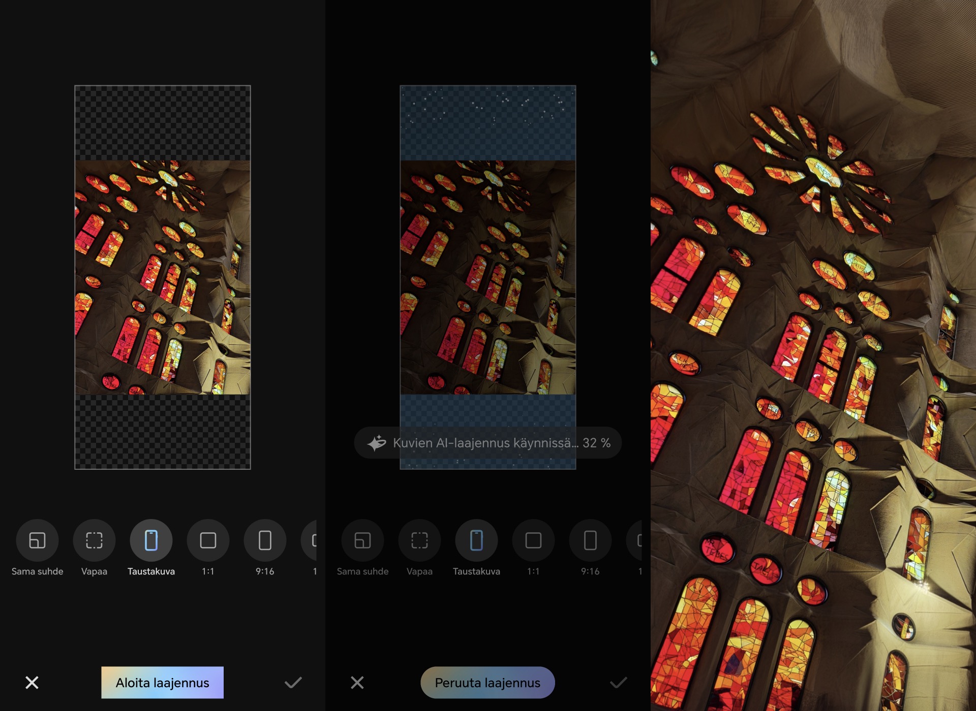AI-laajennukselle voi helposti valita haluamansa kuvasuhteen sekä sen, miten paljon uutta sisältöä alkuperäisen kuvan ympärille luodaan. Tämän jälkeen tekoäly hoitaa kuvan laajentamisen muutamassa sekunnissa.