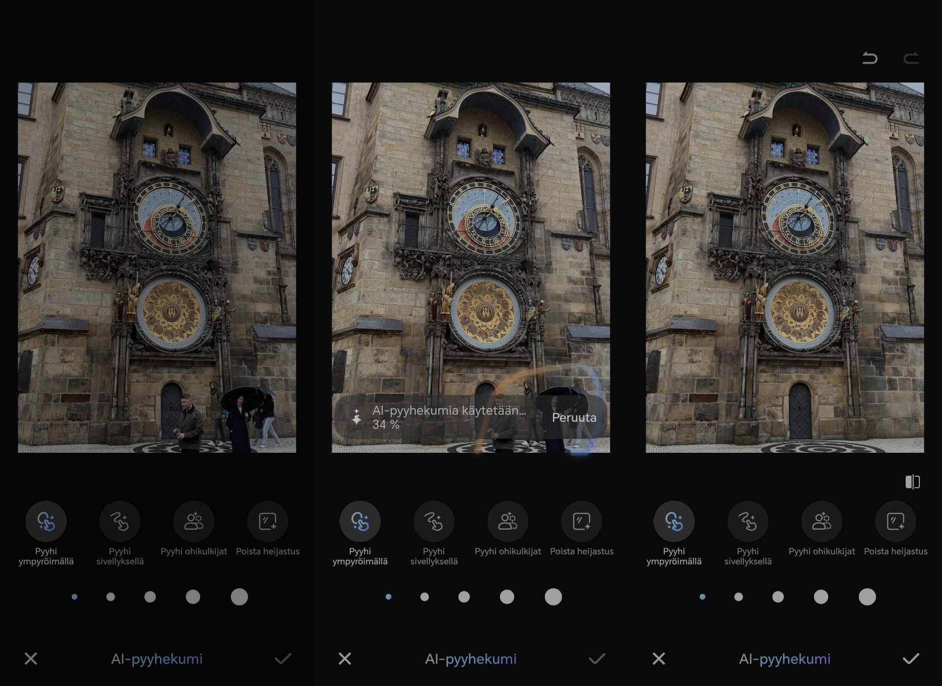 Poistettavaksi halutun kohteen voi merkitä kuvasta ympyröimällä tai pyyhkimällä, minkä lisäksi AI-pyyhekumi tarjoaa pikavalinnat ohikulkijoiden poistamiseen taustalta sekä heijastusten poistamiseen.