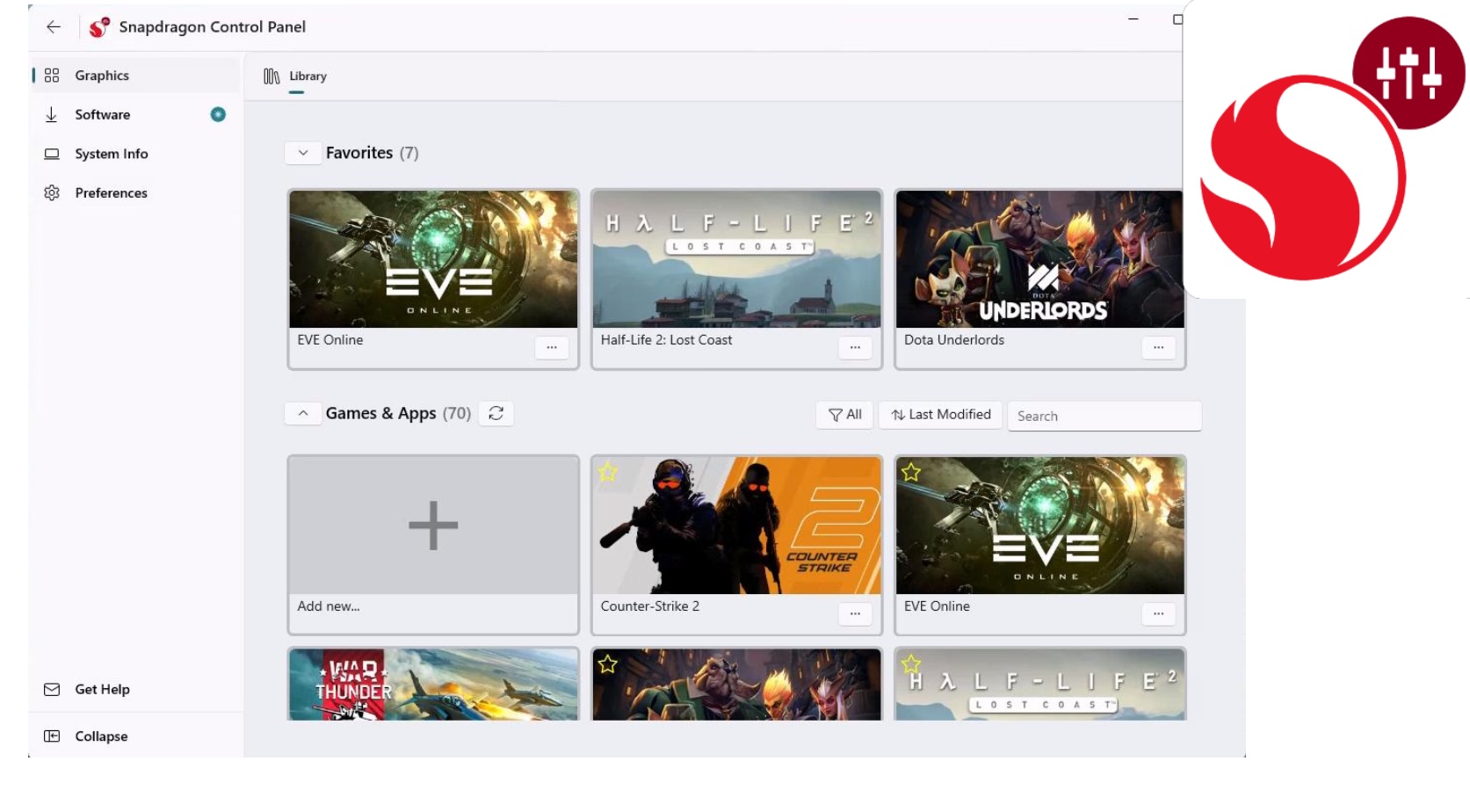 Aiemmin kehittäjille suunnatun Adreno Control Panelin korvaava Snapdragon Control Panel -sovellus tulee yleisesti saataville 19. marraskuuta alkaen Qualcommin verkkosivuilta. Sovellus tunnistaa automaattisesti PC:lle asennetut pelit, myös Steamin osalta, ja tarjoaa niille pelikohtaiset säätömahdollisuudet. Käyttäjä voi muokata esimerkiksi tarkkuuden parantamista, ruudunpäivitysnopeuden rajoitusta, antialiasointia sekä tekstuurien ja yksityiskohtien tasoa.