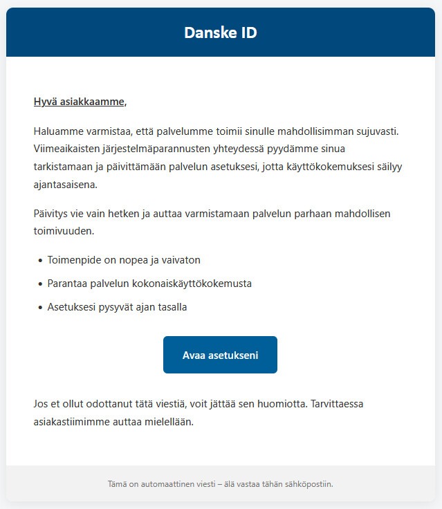 Myös Danske Bankin nimissä ollutta huijausviestiä välitettiin sähköpostitse. Viestissä oleva linkki johti tietojenkalastelusivustolle.