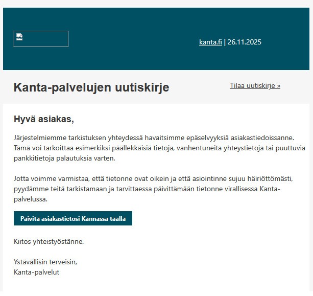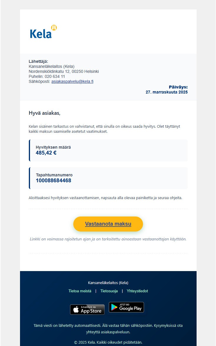 Kelan nimissä välitettiin huijausviestiä sähköpostitse. Viestissä väitettiin, että vastaanottaja on saamassa palautuksen Kelalta. Viestissä ollut linkki johti tietojenkalastelusivustolle.