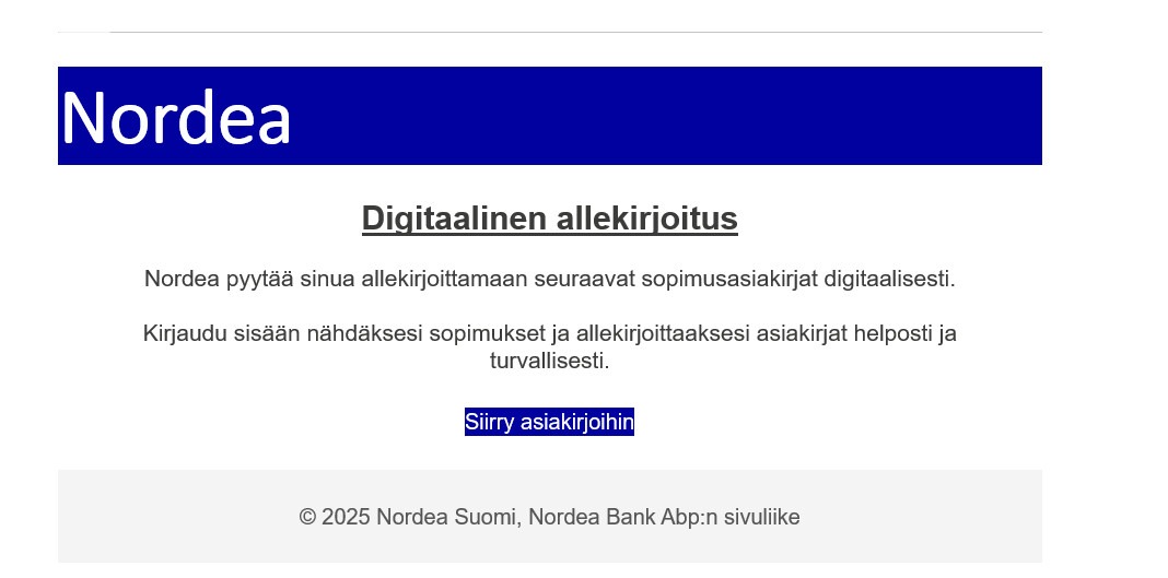 Nordean nimissä levitettiin sähköpostitse huijausviestiä, jossa vastaanottajaa pyydettiin allekirjoittamaan linkin takana väitetysti oleva dokumentti. Linkki johti kuitenkin tietojenkalastelusivustolle.