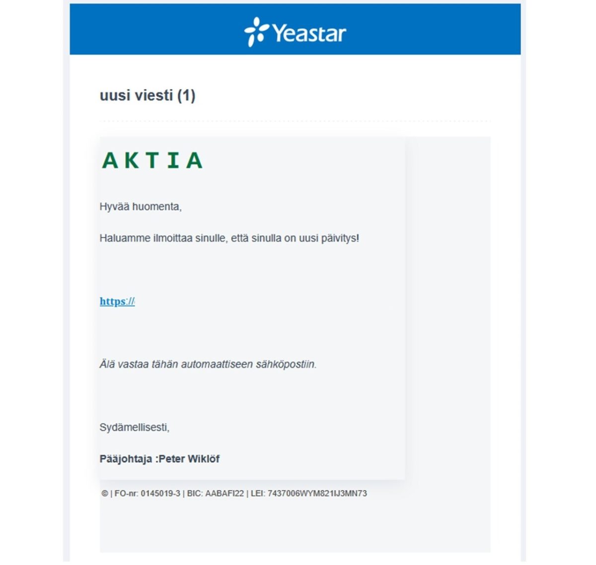 Esimerkiksi kalasteluviestiä Aktian nimissä välitettiin sähköpostitse. Viestissä ohjattiin klikkaamaan linkkiä, jotta vastaanottaja voisi lukea lisätietoja päivityksestä. Linkin avaamalla päätyy tietojenkalastelusivulle.