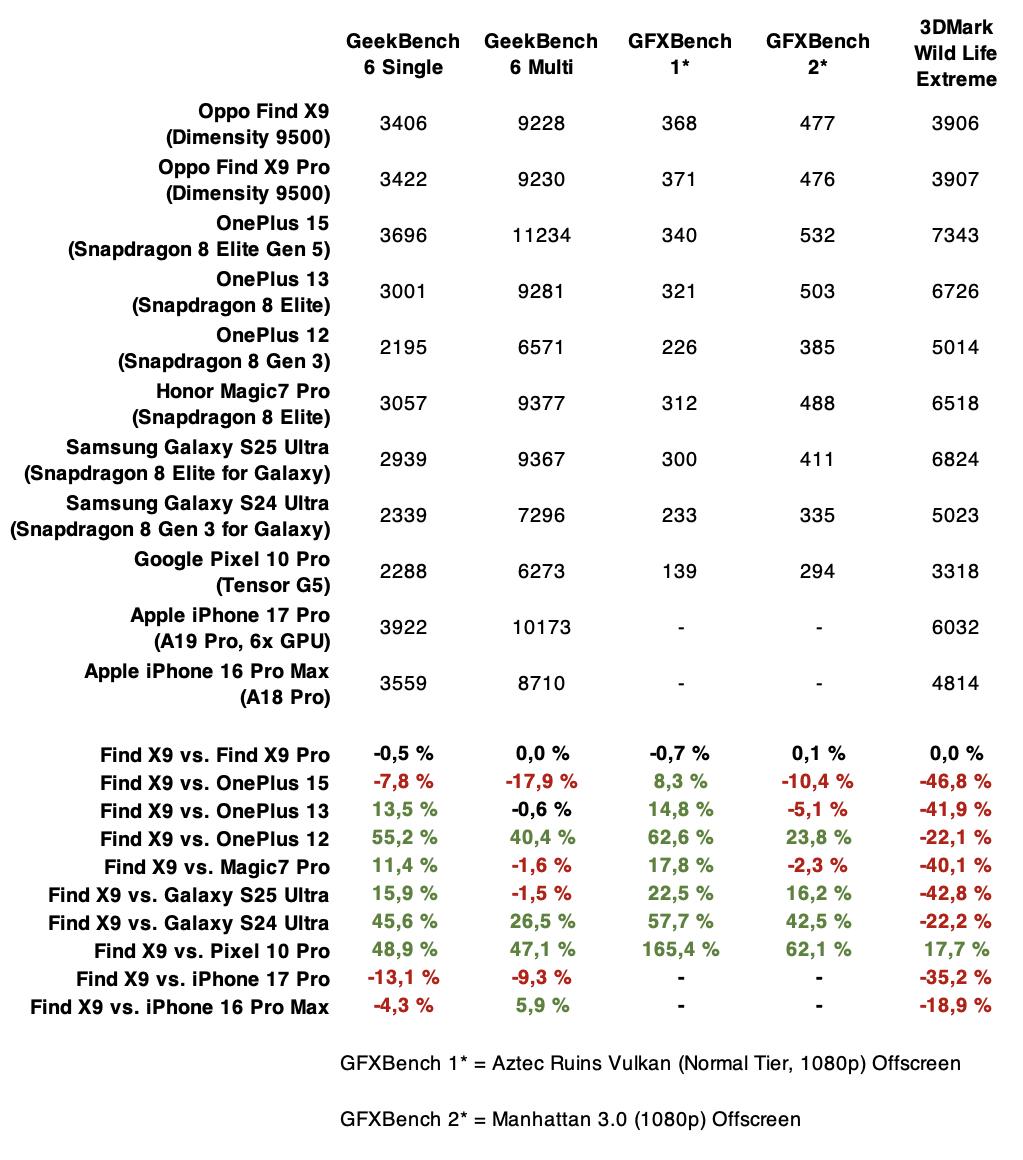 Peruslaskennan suorituskykyä mittaavassa GeekBenchissä Find X9 -puhelimet jäivät OnePlus 15:stä noin 8 prosenttia ja 18 prosenttia yhden ja useamman ytimen testissä, mutta peittoavat edellisen sukupolven Snapdragon 8 Elite -puhelimet yhden ytimen suorituskyvyssä.