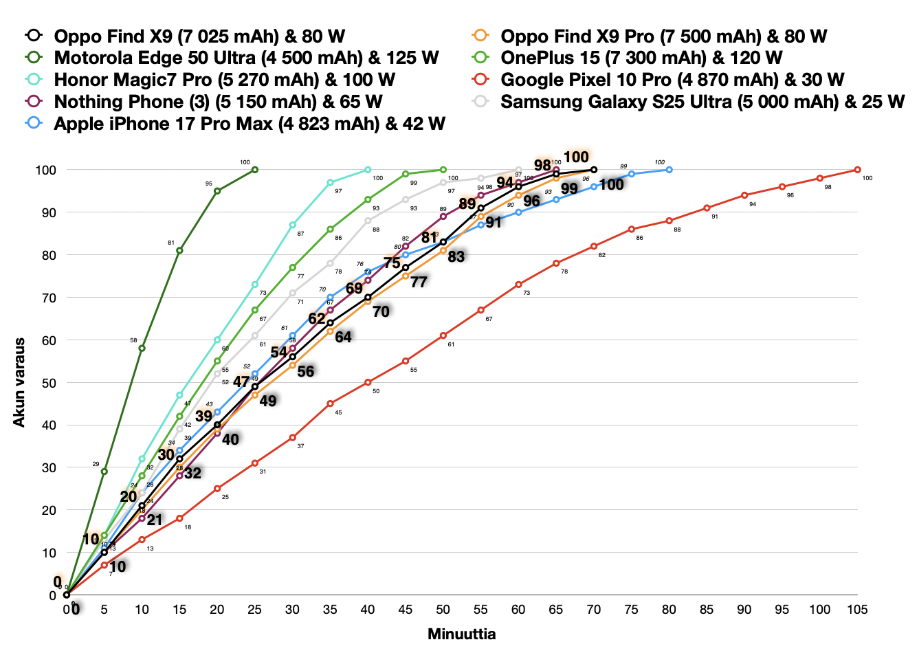 Markkinoiden nopeimpien joukkoon pikalataus ei Find X9 -puhelimissa yllä, ja esimerkiksi OnePlus 15 sen 120 watin pikalataustuella latautuu nopeammin.