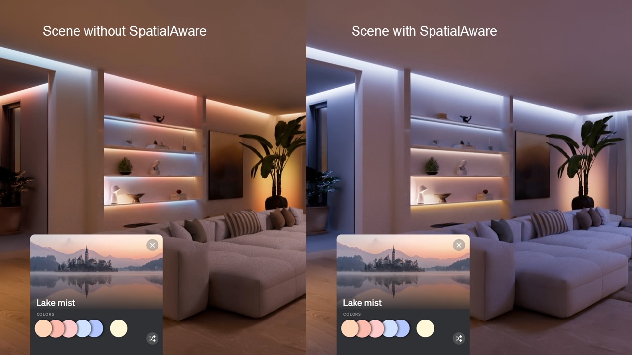 SpatialAware saa valaistusasetukset tuntumaan todenmukaisemmilta. Auringonlaskua jäljittelevässä valaistusasetuksessa huoneen toisen puolen valot loistavat lämpimän keltaisissa sävyissä kuin laskeva aurinko, ja toisessa päässä valo on himmeämpää.
