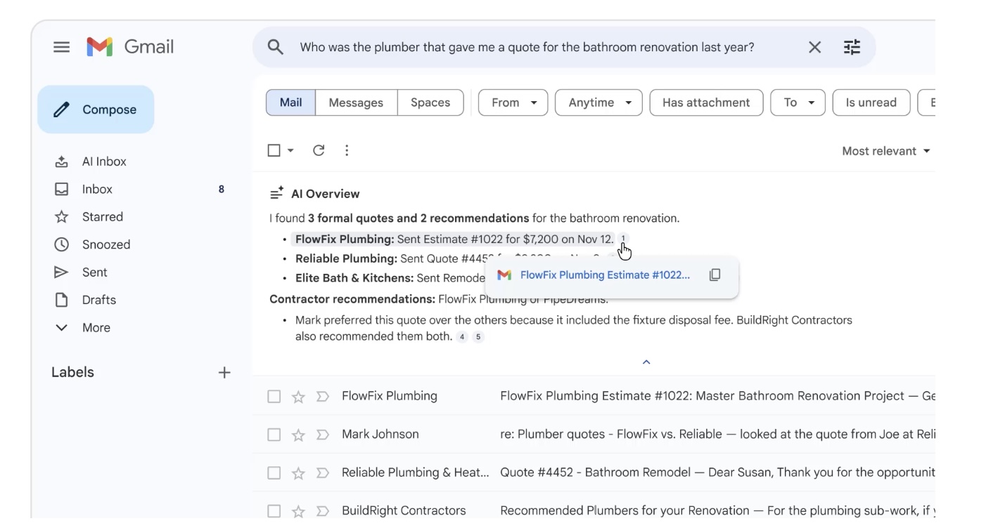 AI Overviews -yhteenvedot tuovat Gmailin hakuun samanlaisen tekoälykokemuksen kuin Google-haussa.