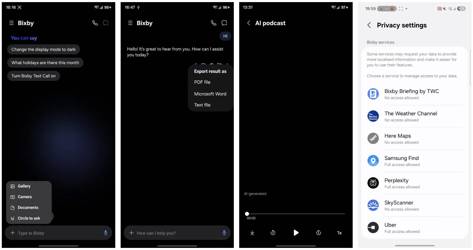 Uusi Bixby tukee myös kameran ja äänitiedostojen käyttöä pyynnöissä. Lisäksi tekoäly pystyy luomaan niin sanottuja ”AI-podcasteja”, kuten on aiemmin tuttua Googlen NotebookLM:stä.