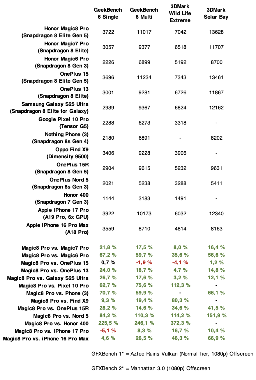 Snapdragon 8 Elite Gen 5 -puhelimet, kuten Magic8 Pro, yltävät 10-20 prosenttia parempiin grafiikkasuorituskyvyn testituloksiin kuin Applen viimeisimmät iPhone 17 Prot. Yhden ytimen keskussuorittimen suorituskyvyssä iPhone 17 Pron A19 Pro -piiri on yhä niukasti edellä.