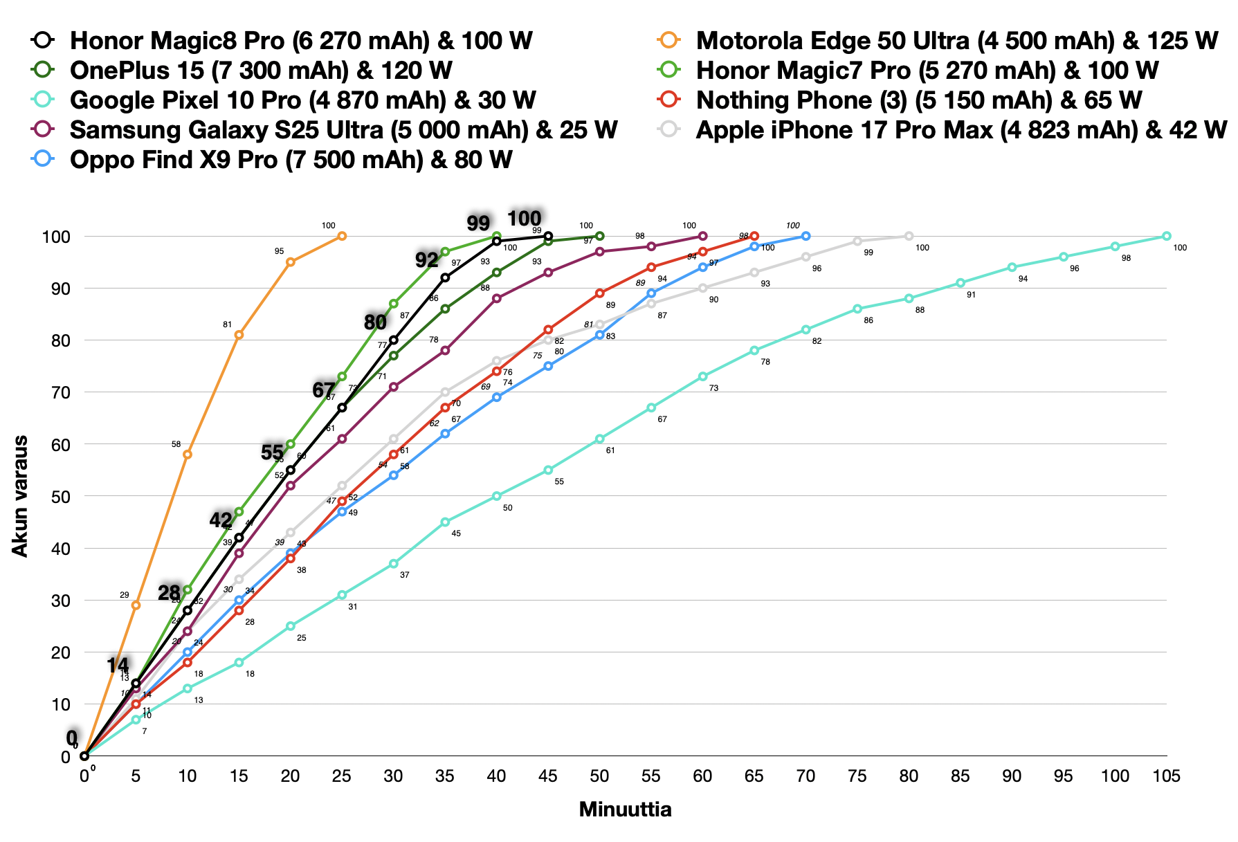 Testissämme Honor SuperCharge -laturilla Magic8 Pro latautui 15 minuutissa 42 prosentin ja 30 minuutissa jo 80 prosentin varaukseen asti. Täysi lataus vei vain alle 45 minuuttia.