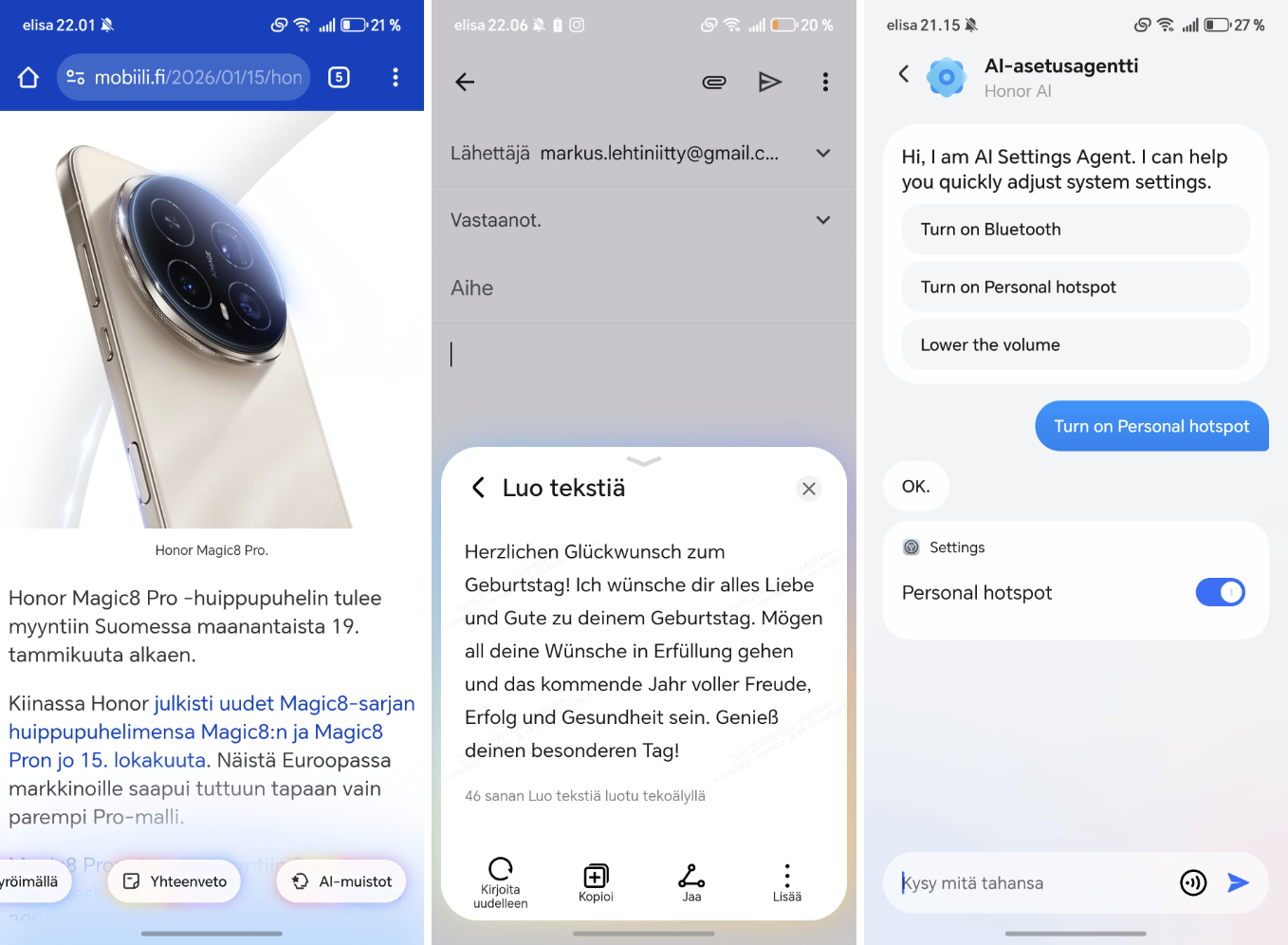Tekoälyä Honor on tuonut MagicOS 10:ssä lisää myös uudella AI Settings Agentilla. Englanniksi toimivalla agentilla voi puhumalla tai kirjoittamalla pyytää puhelinta muuttamaan asetuksia. Tietyissä tilanteissa tämä voi olla jopa kätevää, mutta toki englanninkielisyys rajoittaa vielä osin hyödyllisyyttä.
