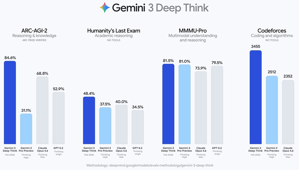 Esimerkiksi testeissä ARC-AGI-2, Humanity’s Last Exam, Codeforces: Elo ja International Math Olympiad 2025 päivitetty Gemini 3 Deep Think on saavuttanut huipputuloksia.