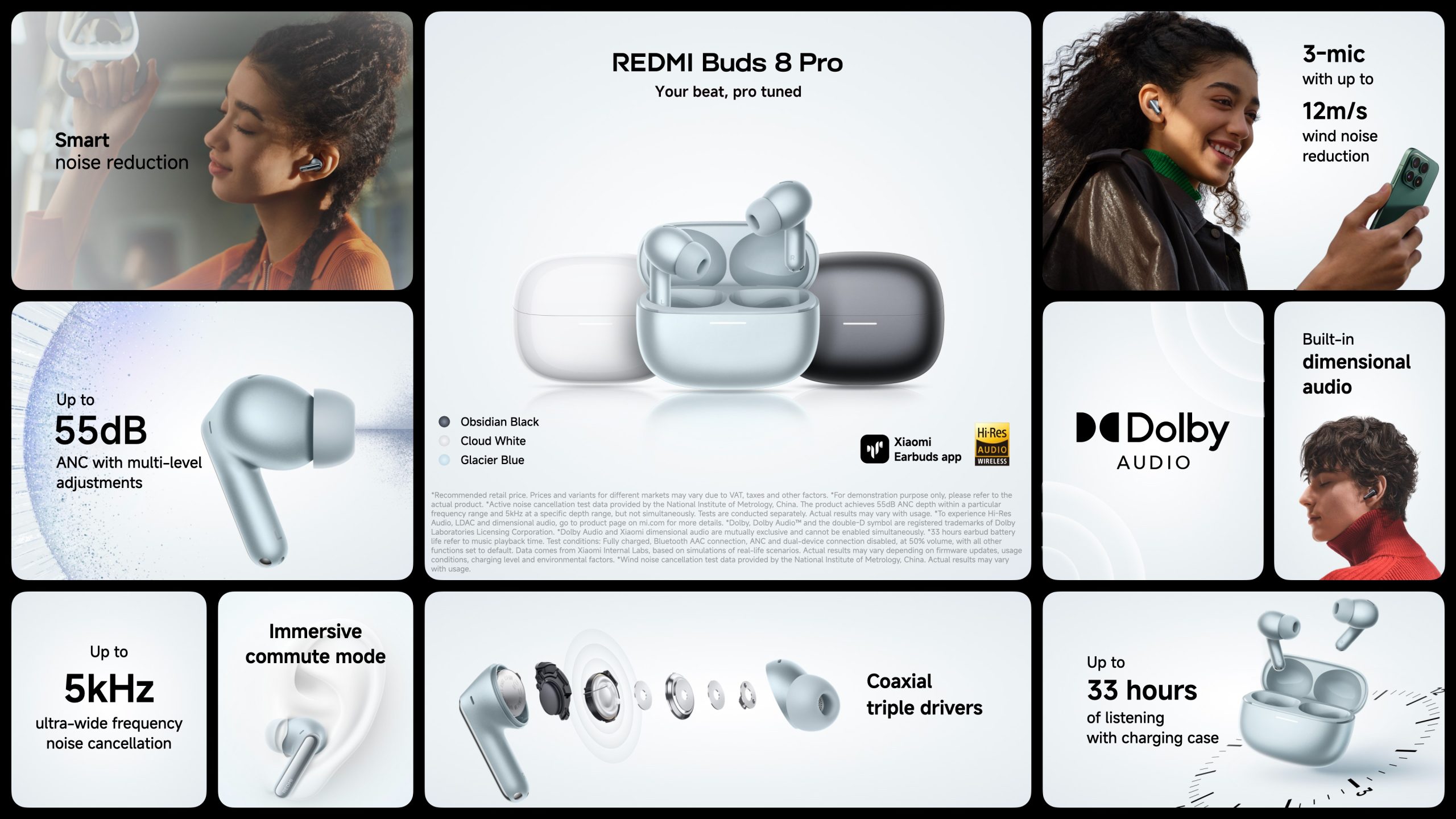 Lisäksi Xiaomin uutuuksiin kuuluivat myös täyslangattomat Redmi Buds 8 Pro -nappikuulokkeet, joissa on kolmiosainen äänentoisto, jopa 55 desibelin melunvaimennus laajalla 5 000 hertsin toiminta-alueella sekä tuki tilaäänelle. Akunkesto latauskotelon kanssa yltää jopa 33 tuntiin.