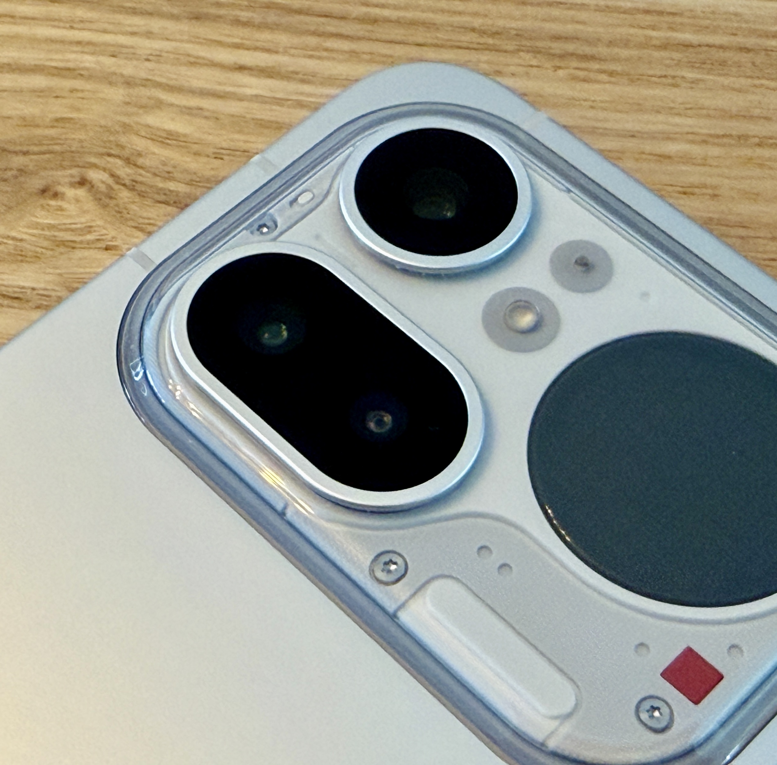 Samanaikaisesti hillittyä vaikutelmaa luovan metallirungon kanssa Phone (4a) Prossa on mukana yhä myös jotakin Nothingille ominaista. Kameroita ja Glyph Matrix -näyttöä ympäröi läpinäkyvyyden ideaa jatkava ”ikkuna”.