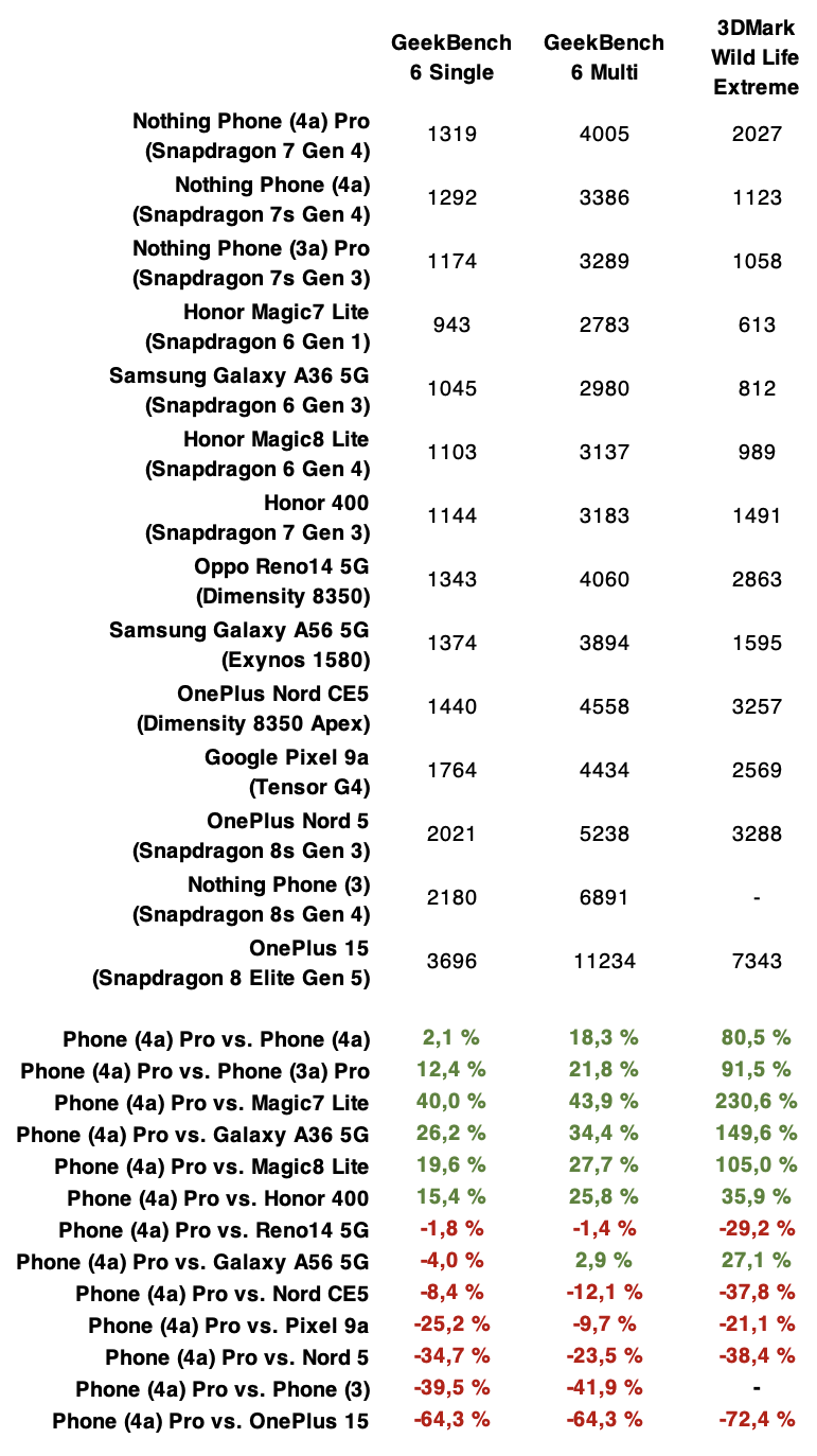 Samsungin vuoden 2025 Galaxy A56 5G:n Phone (4a) Pro peittoaa kokonaisuutena suorituskyvyssä, mutta häviää selvästi Googlen Tensor G4:llä varustetuille Pixel 9a:lla ja uudemmalle Pixel 10a:lle sekä OnePlussan Nord CE5:lle ja Nord 5:lle. Näistä Nord CE5:tä myydään alle kahdella sadalla eurolla, joten yli tuplaasti kalliimman Phone (4a) Pron häviämistä sille ei voi pitää kovin vahvana suorituksena.
