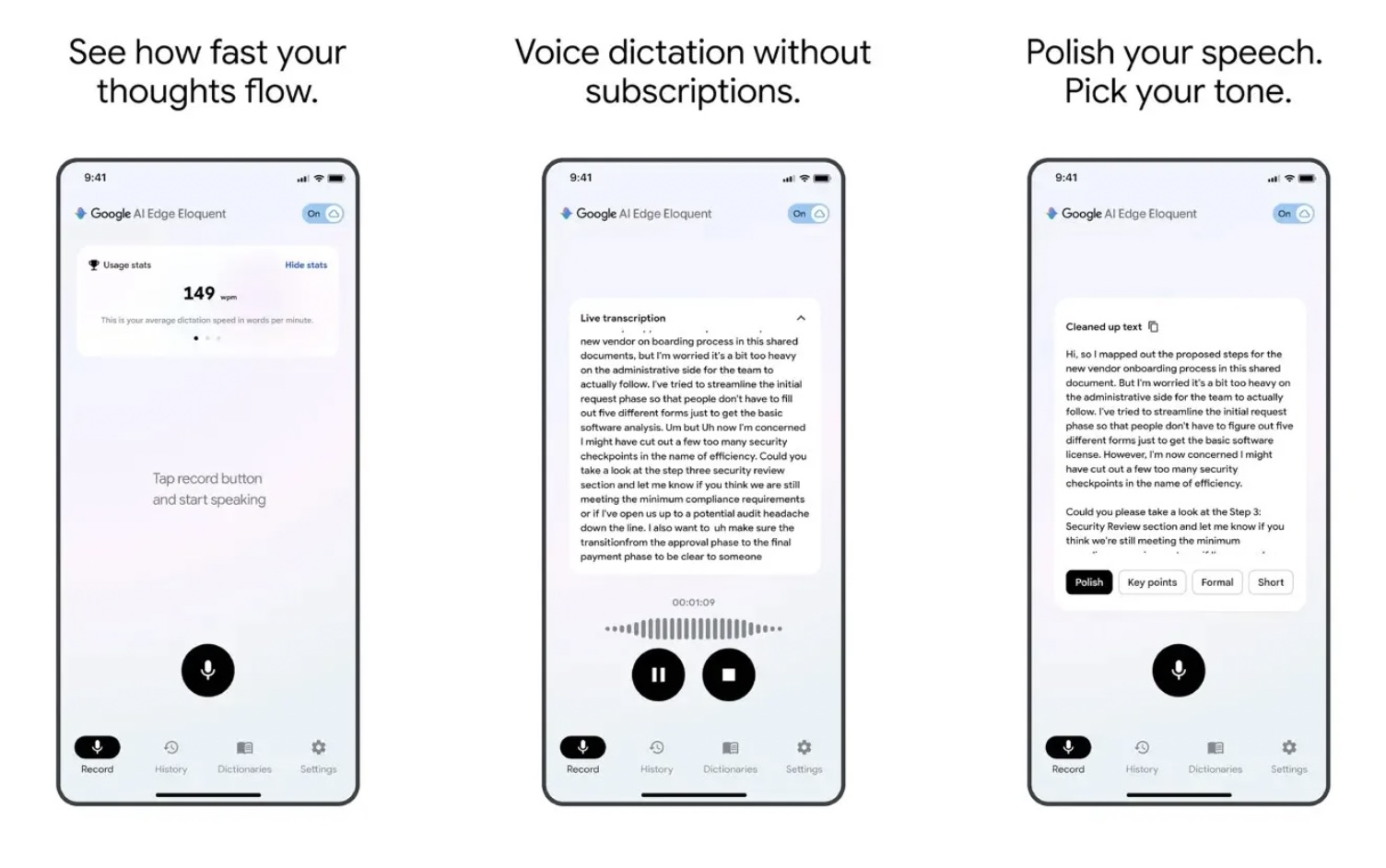 Google korostaa, että kyseessä on puheentunnistustyökalu ilman tilausmaksuja ja käyttörajoituksia. Sovellus kuuluu yhtiön AI Edge -brändin alle, jolla viitataan laitteella suoritettaviin tekoälyratkaisuihin.
